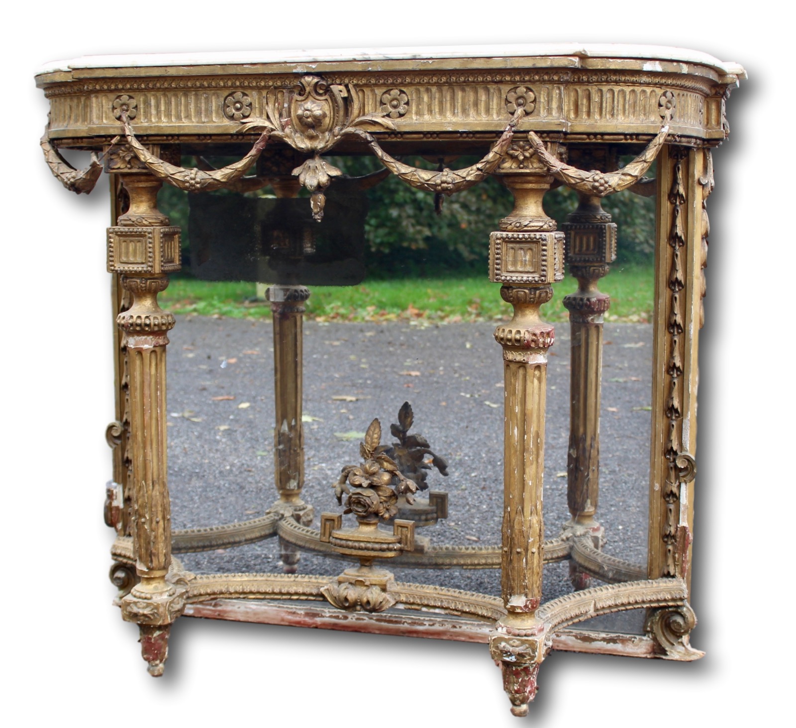 A highly decorative 18th century gilt console table with original marble top and mirrored back.