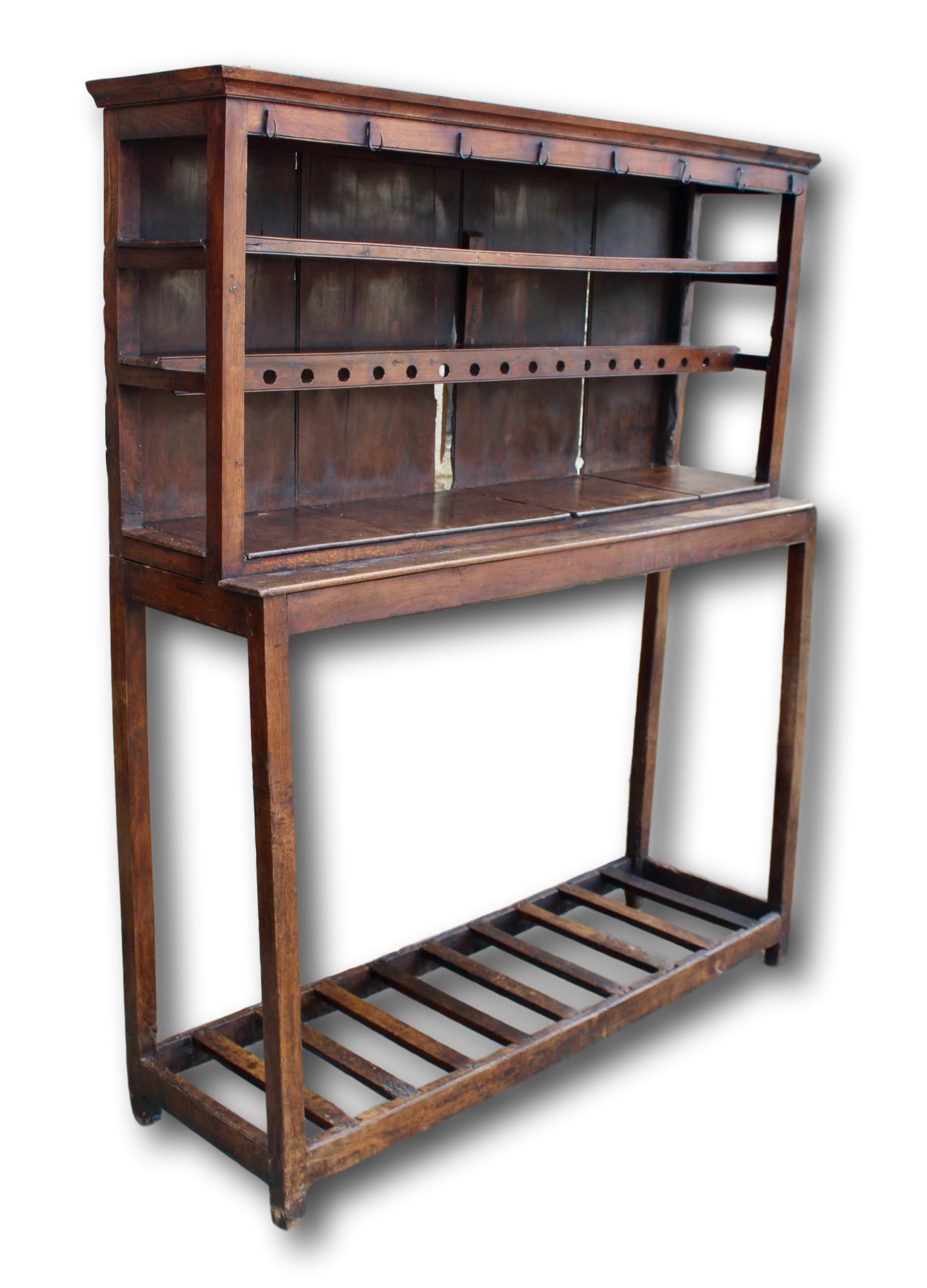 A fabulous 18th C (1780) Irish Oak dresser. An unusual model with an open base which would have been used to store milk churns and other larger items. The top has three shelves and a row of hooks. Structurally very solid and with a fabulous overall look. This would be a wonderful statement piece in a traditional or more contemporary kitchen.