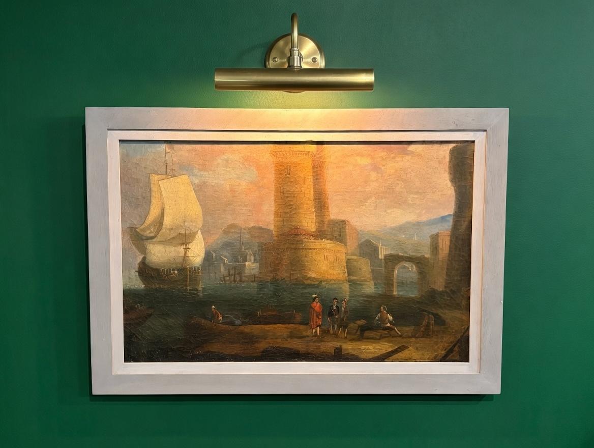 A charming provincial oil on canvas of a harbour scene with ships and towners in the background.