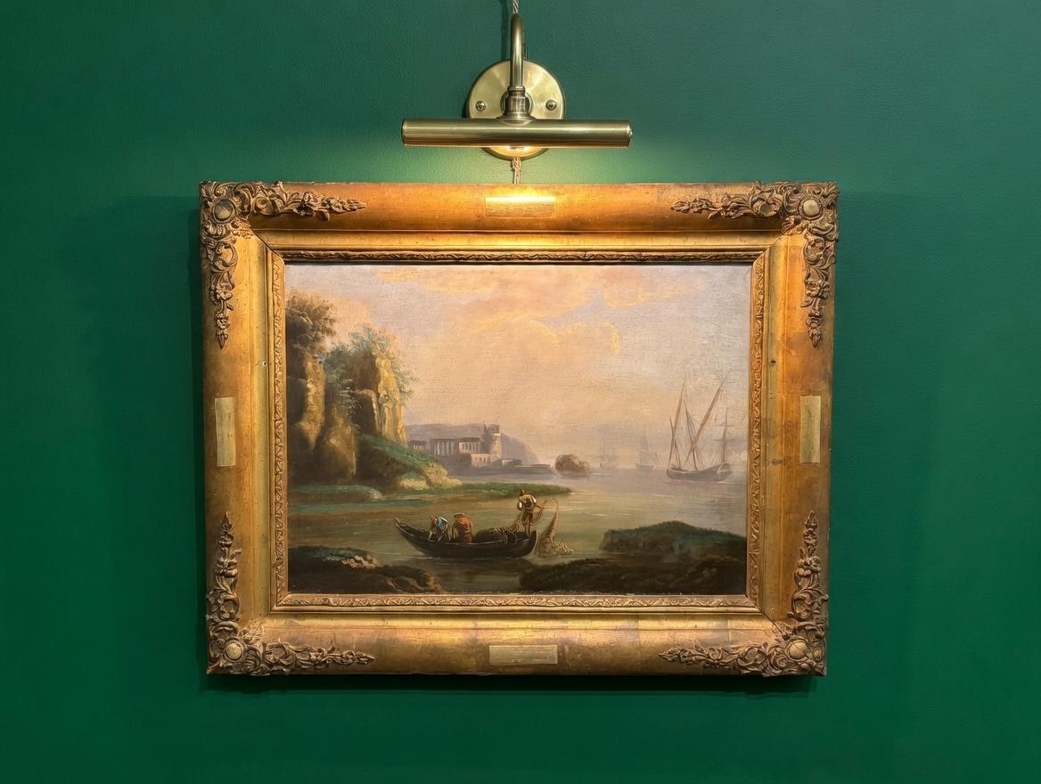 A very good quality 18th century continental oil on canvas. Showing fishermen in the foreground with ruins and other ships behind.