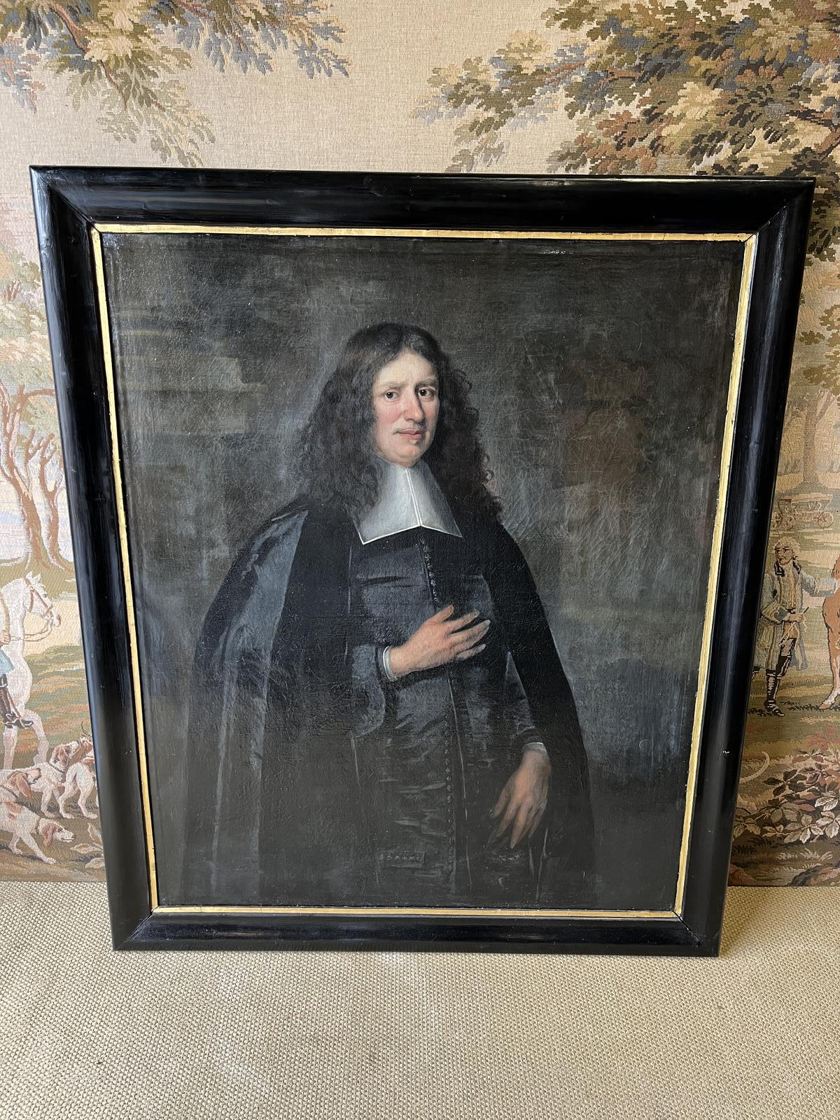 This is a superb quality early 18th century (possibly 17th century) oil on canvas portrait, depicting a Puritan man in black dress. In later ebonised and gilt frame.
