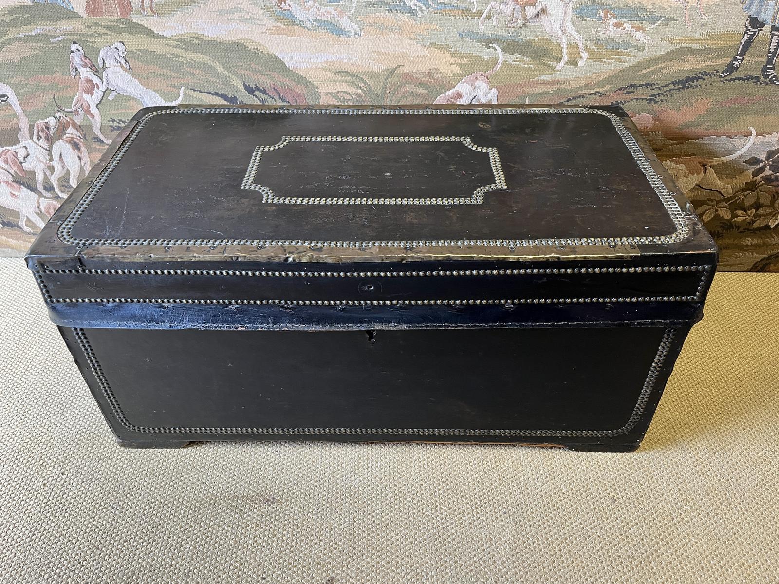 19th Century Black Leather Camphor Wood Traveling Trunk with Brass Decoration