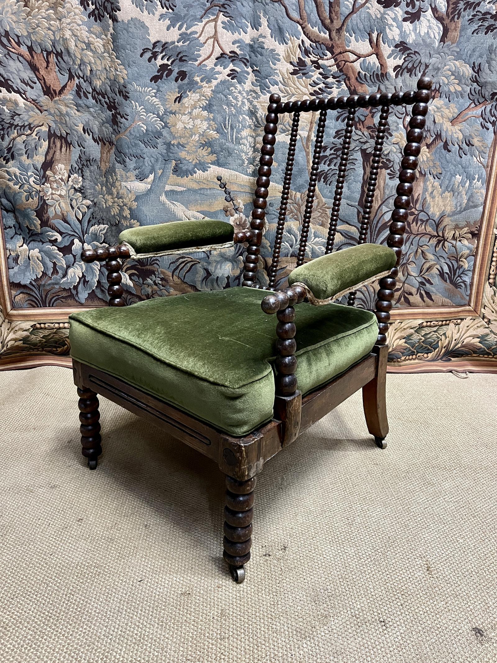 This is a good quality 19th Century antique bobbin armchair with good quality green fabric upholstery.