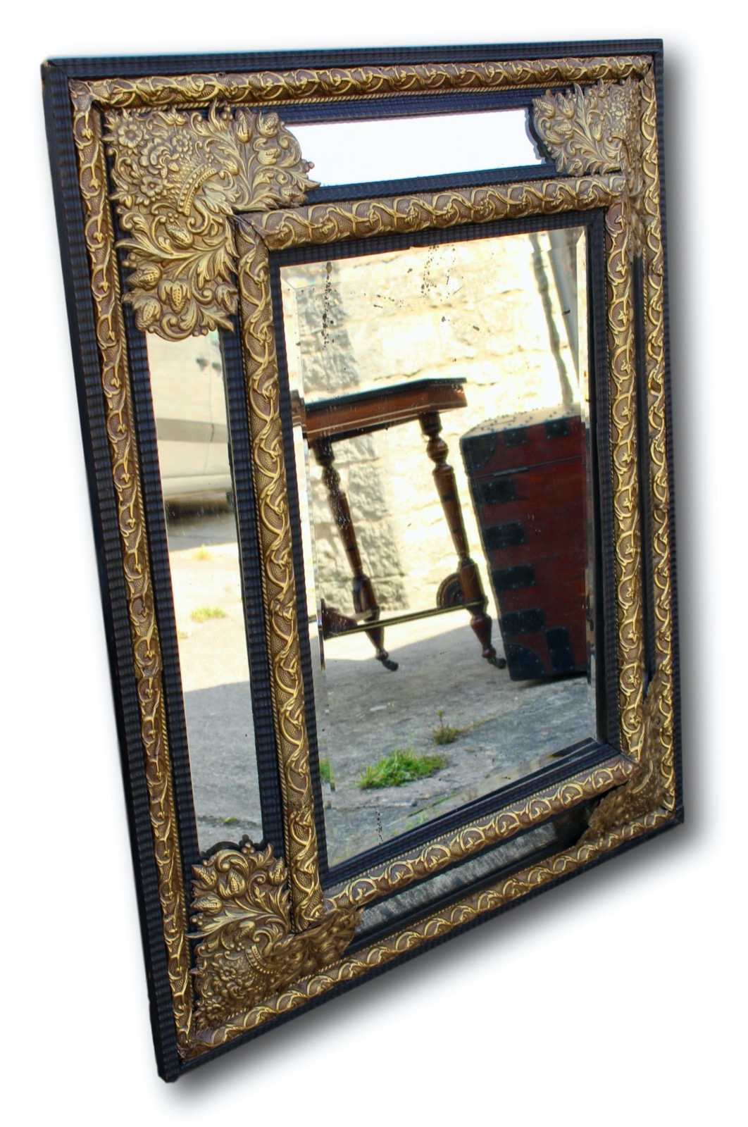 A superb quality 19th Century (1880) antique brass and ebonised cushion mirror in good condition with original bevelled glass mirror plates.