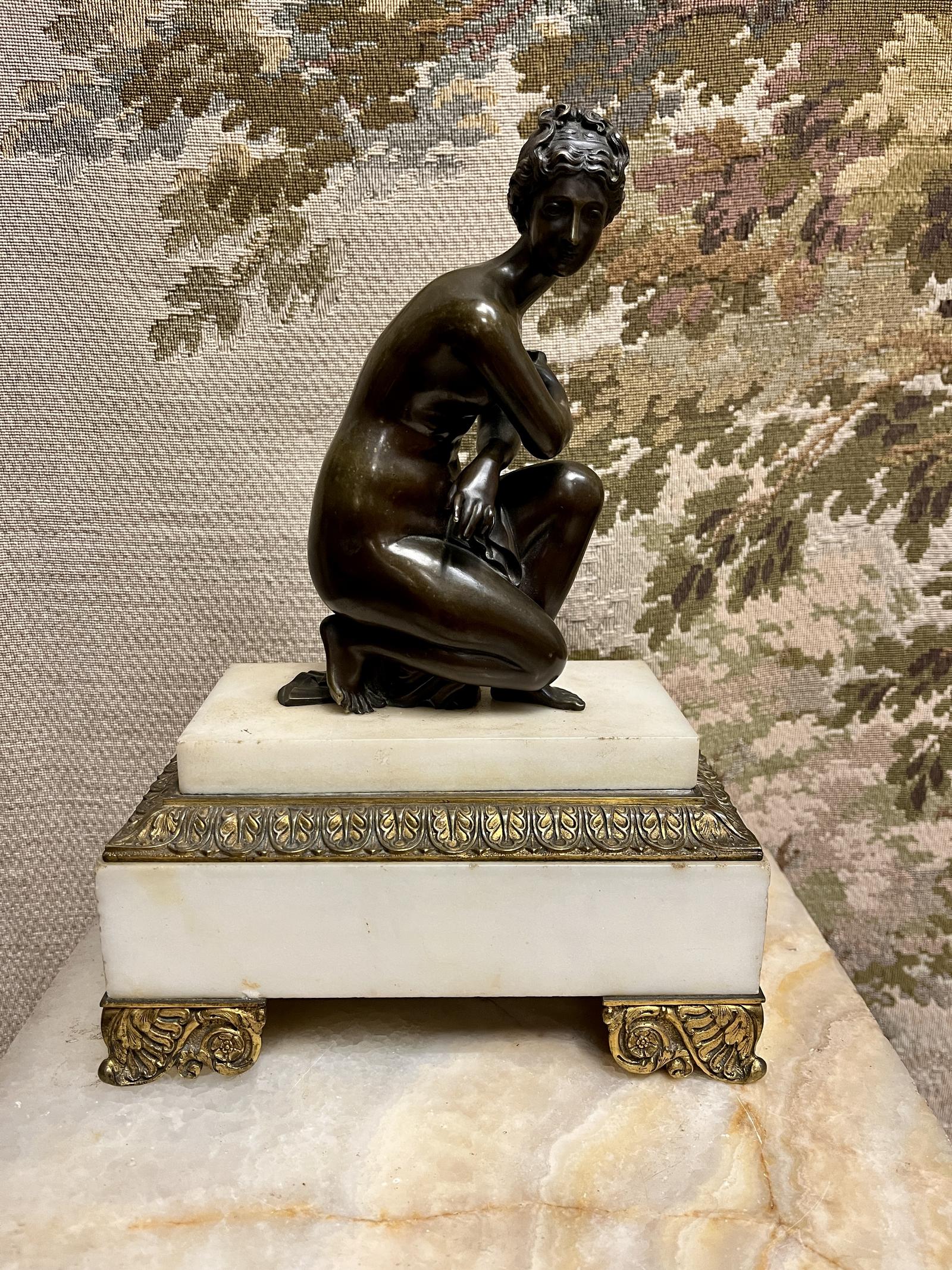This is a stunning 19th Century (1860) antique bronze sculpture depicting 'Crouching Venus' on bronze and ormolu plinth. Overall condition is very good.