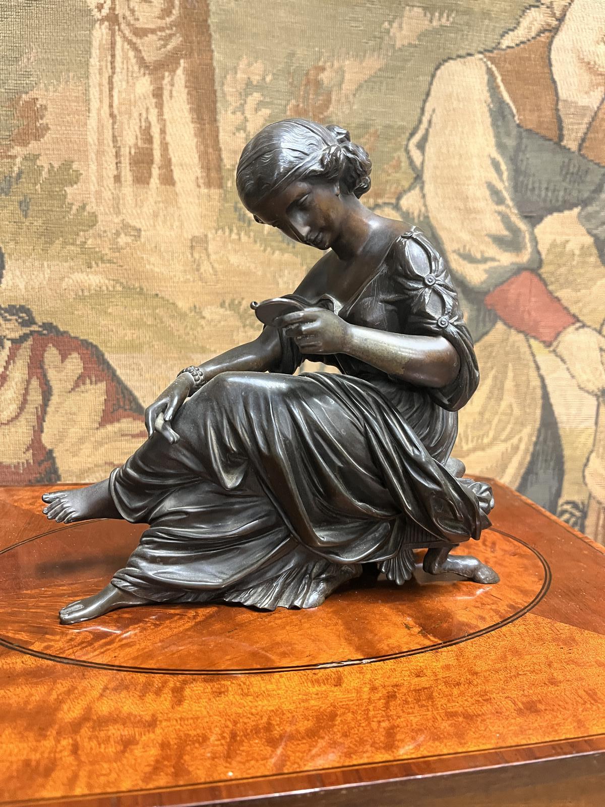This is a superb quality bronze sculpture depicting a lady sitting, looking at an image of her husband. Exceptionally good quality and condition.
