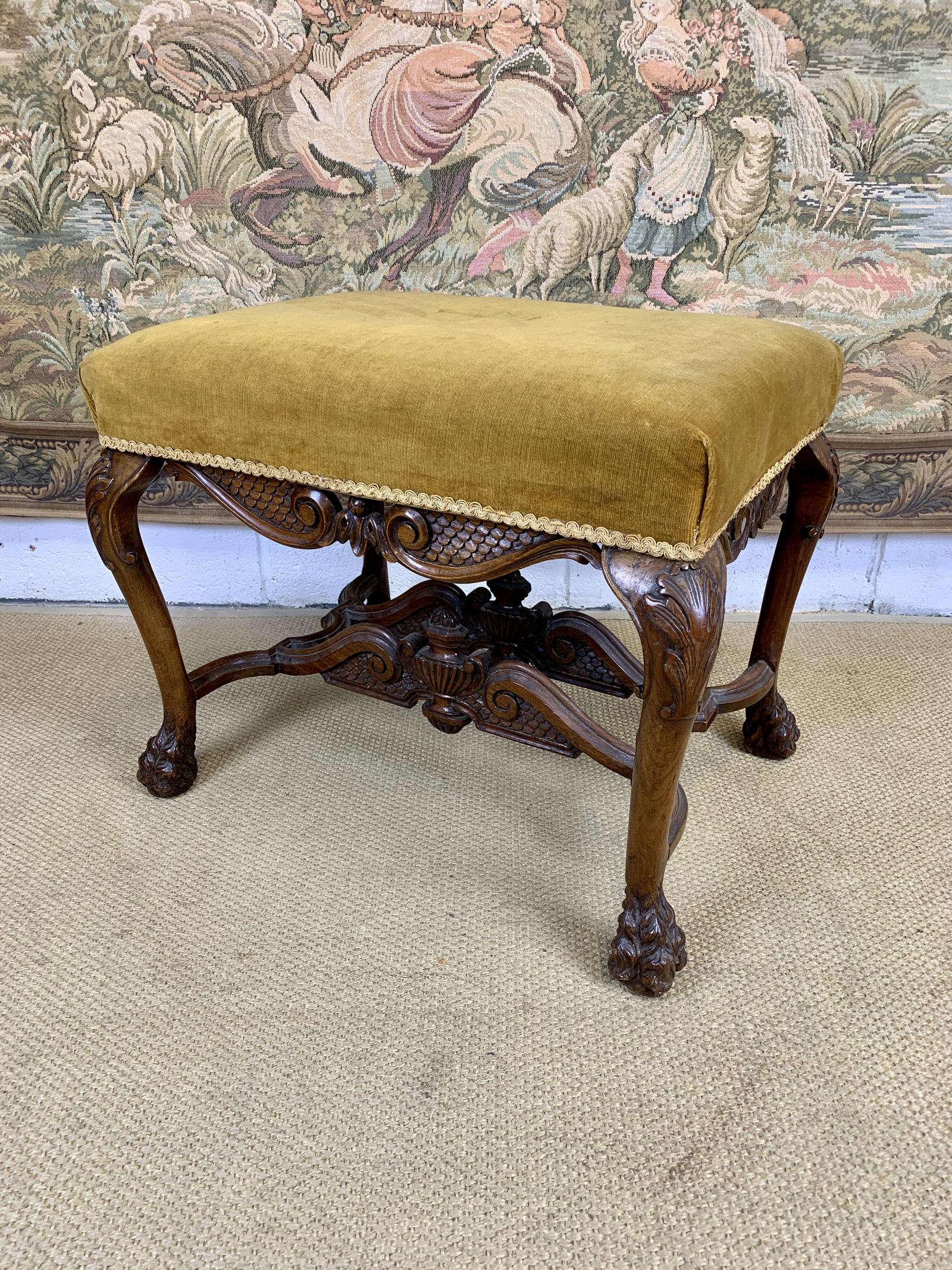 19th Century Carved Walnut Foot Stool with Mustard Upholstery