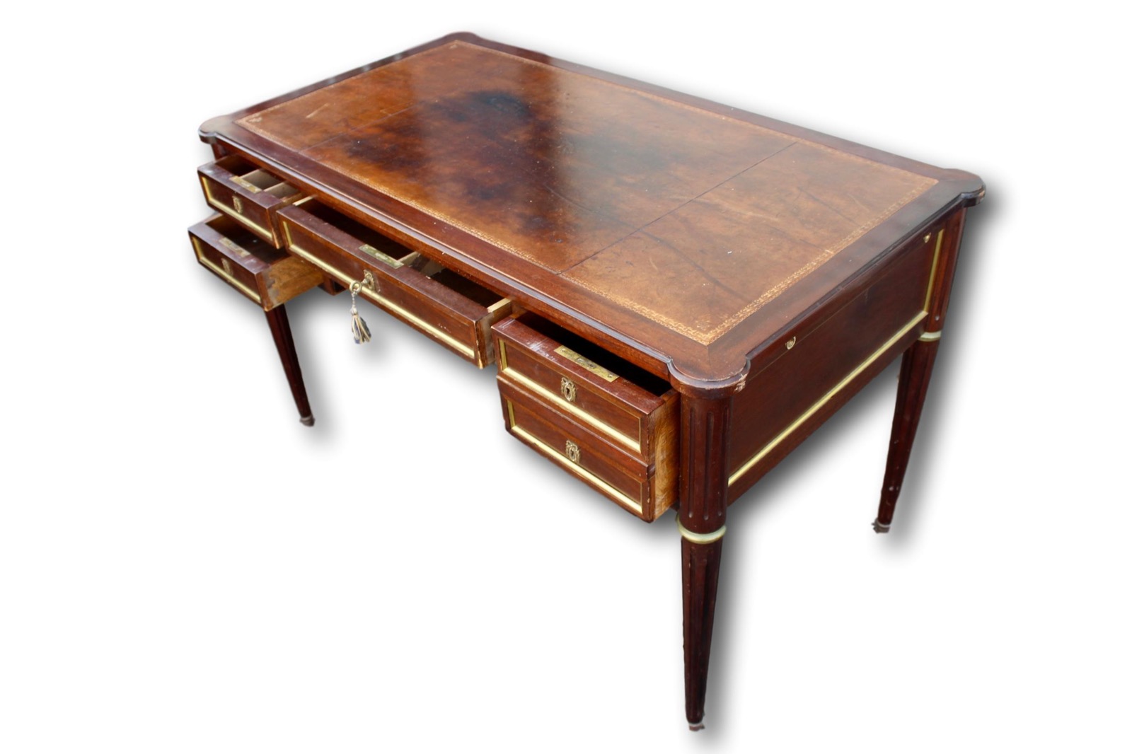 This is a very attractive 19th Century antique desk with four drawers and brass details made in France around 1880, this desk is in overall very good condition (having been re waxed since being photographed).