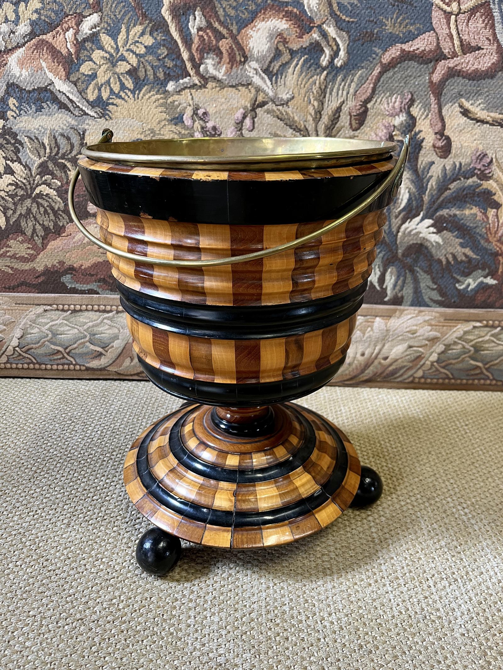 This is a very good quality 19th Century (1880) Dutch antique peat bucket made from mixed fruitwoods with ebonised banding and feet. It retains the original brass tray.