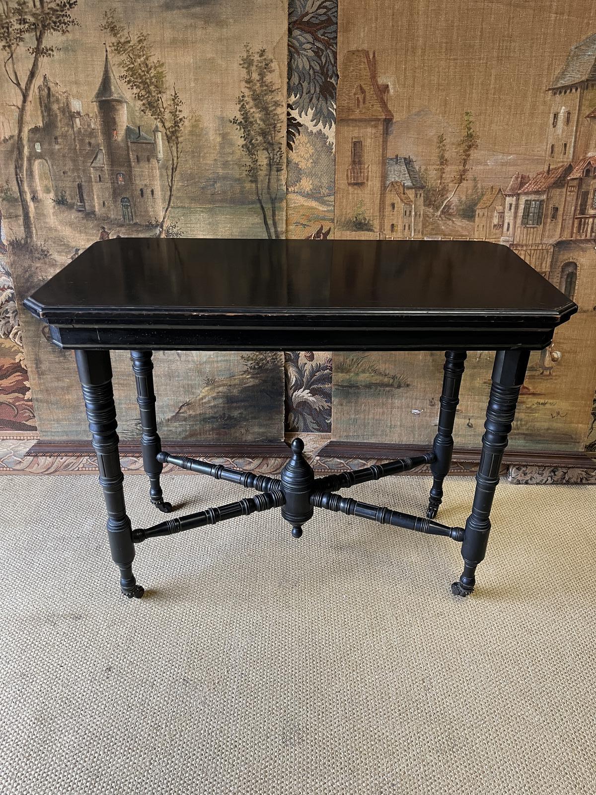 This is a very attractive 19th Century (1880) antique ebonised card table that opens to reveal pink baize. Overall in good original condition with lovely patina. It stands on original casters.