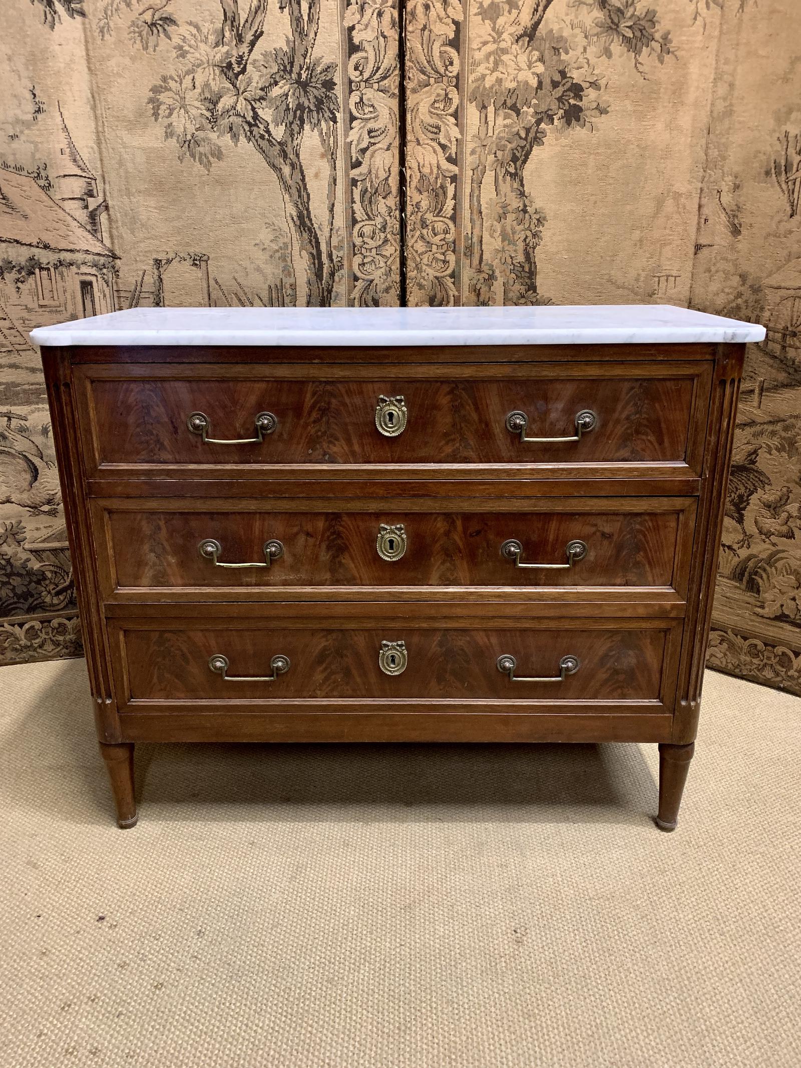 This is a stunning French 19th Century antique commode, with white marble top and ormolu handles. It is in good original condition and a superb, versatile size.