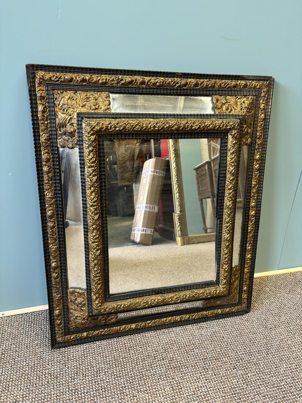 This is a very good quality late 19th Century (1880) French antique cushion mirror with brass decoration and ebonised timbers throughout.