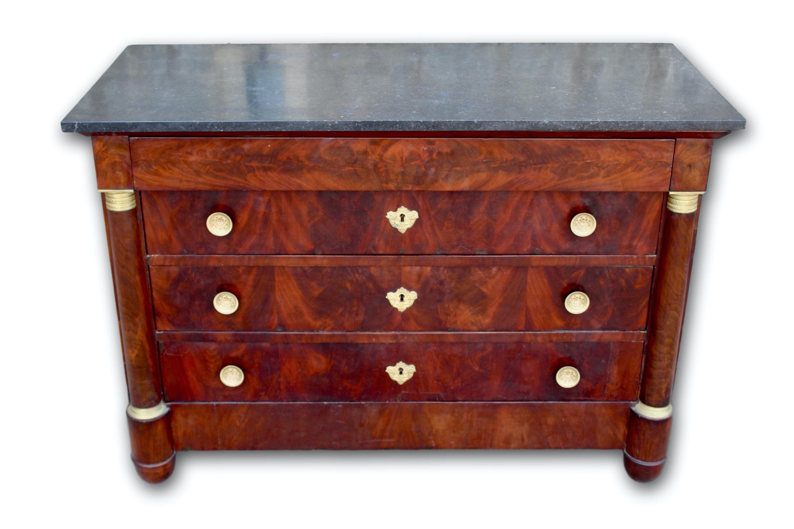 A very stylish, super quality French Empire commode made around 1880 from good quality mahogany and with ormolu decoration and handles. Original black marble top in good condition also.