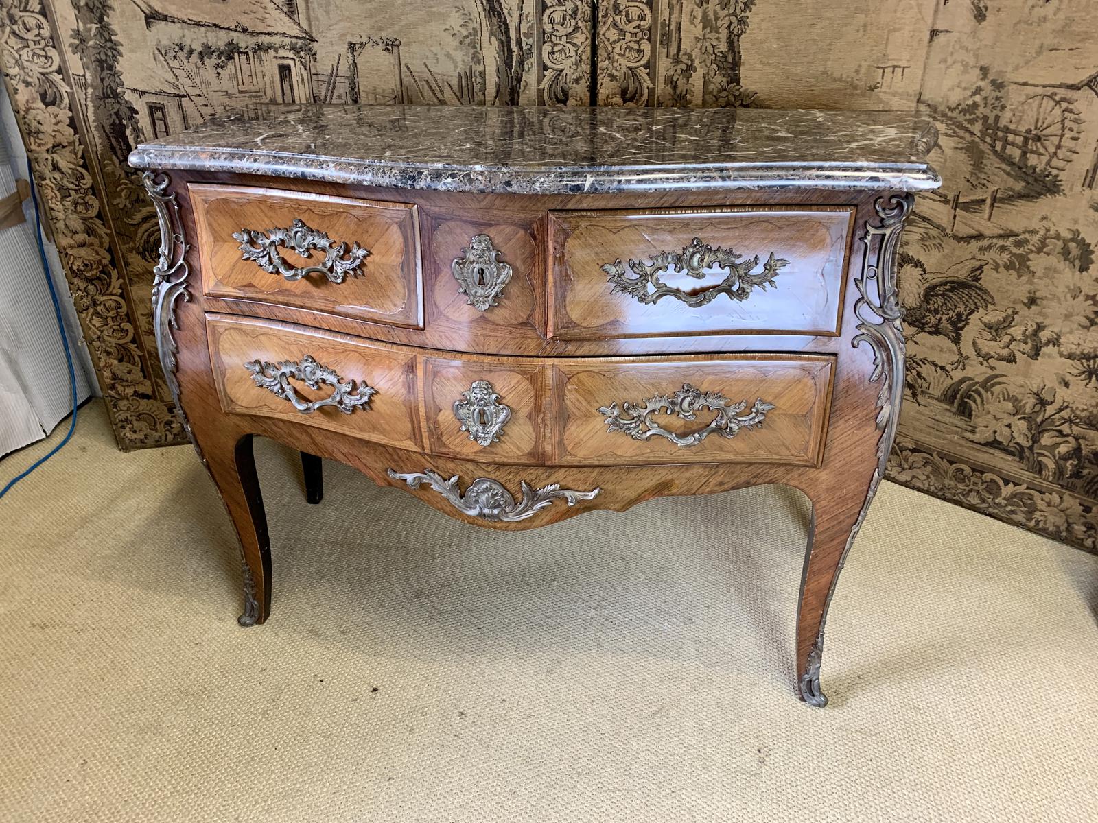 This is a stunning French 19th Century (1860) antique commode with marble top, mixed timber inlays and ormolu handles.
