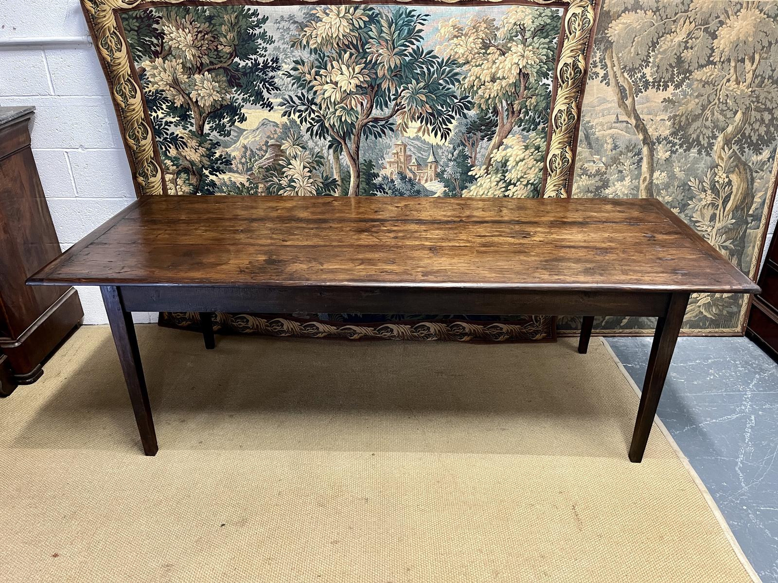 This is a very good quality late 19th Century (1890) antique farmhouse table made from fruitwood (likely pear wood) with a three plank top and square tapering legs.