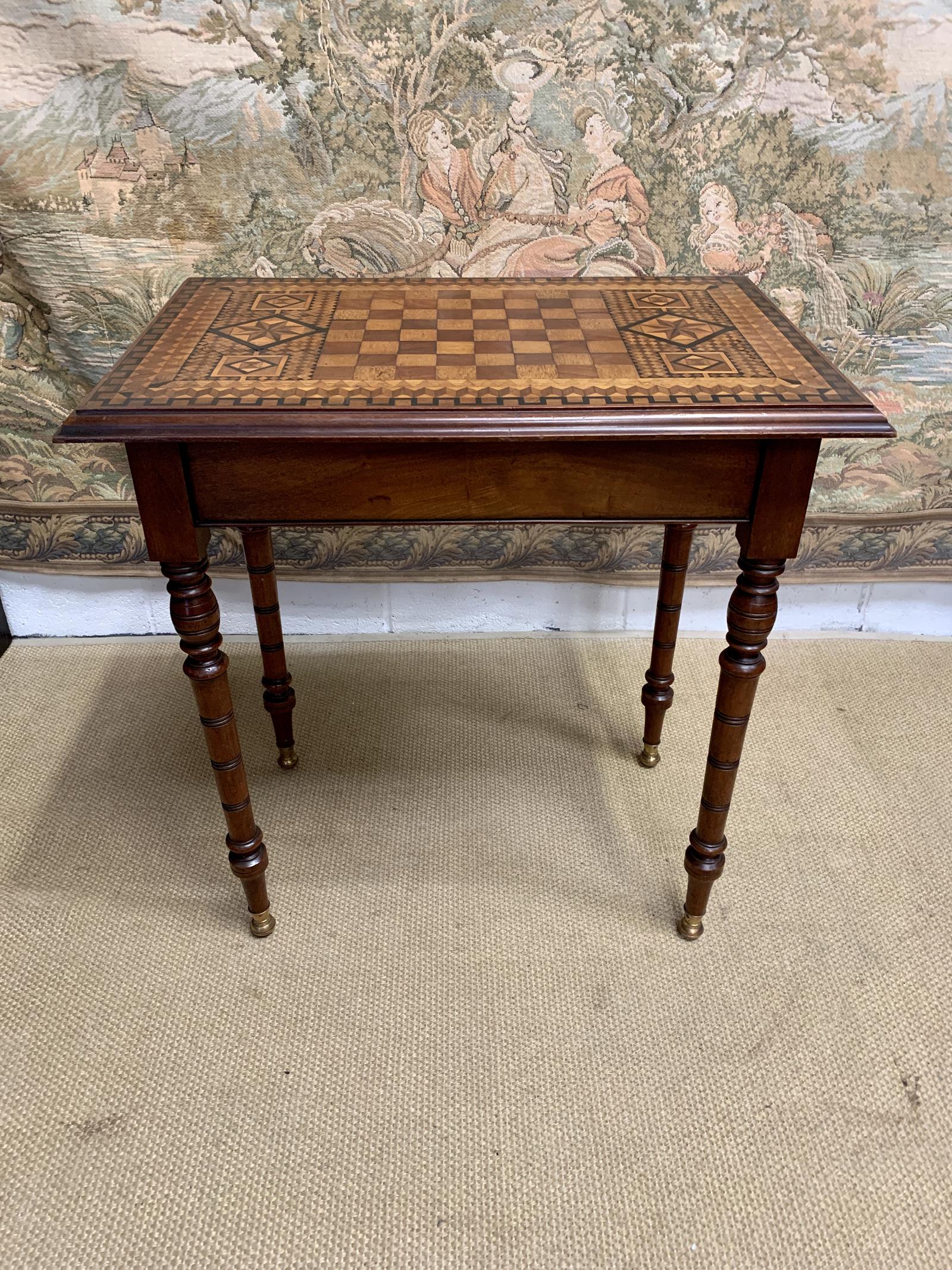 A stunning 19th Century (1890) antique table. The top inlaid with the pattern of a games board. On brass feet with a single drawer to one end. Original lock and working key.