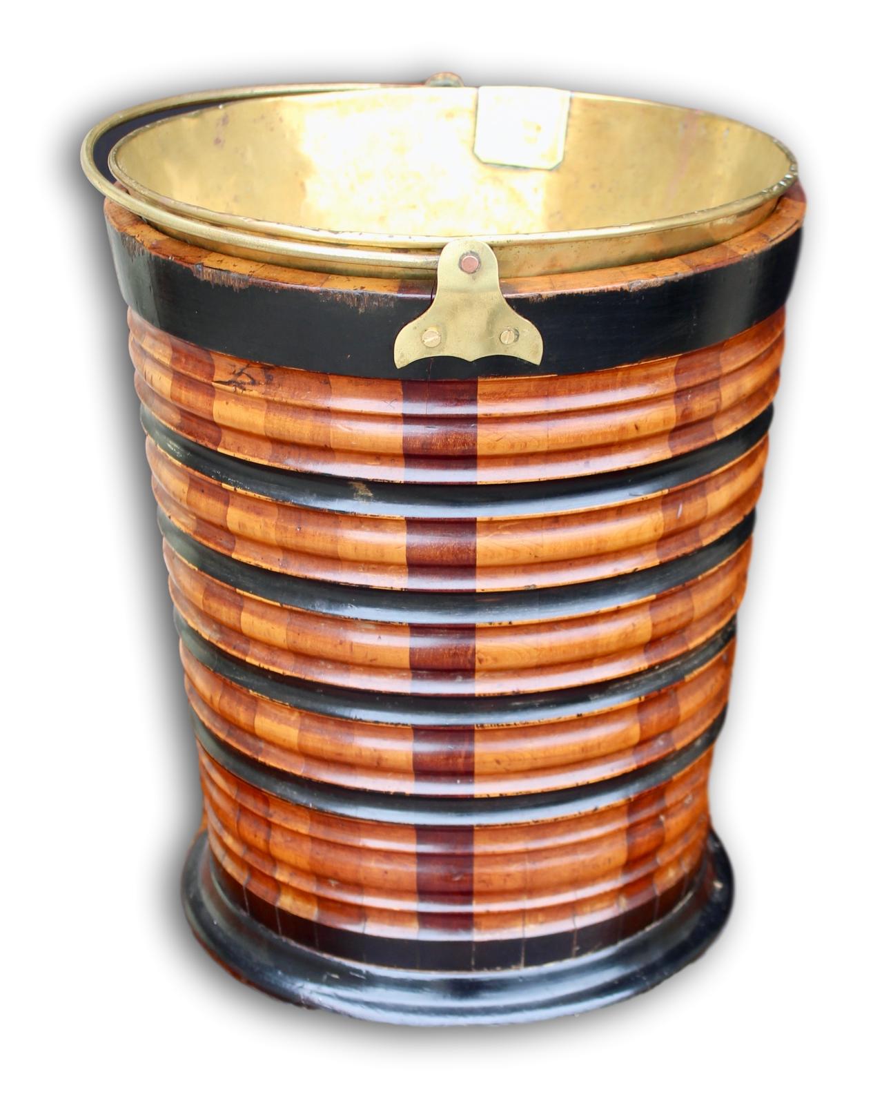 A highly desirable 19th Century (1850) antique Irish peat bucket with brass lining and handle, made from mixed fruitwoods with ebonised detail.