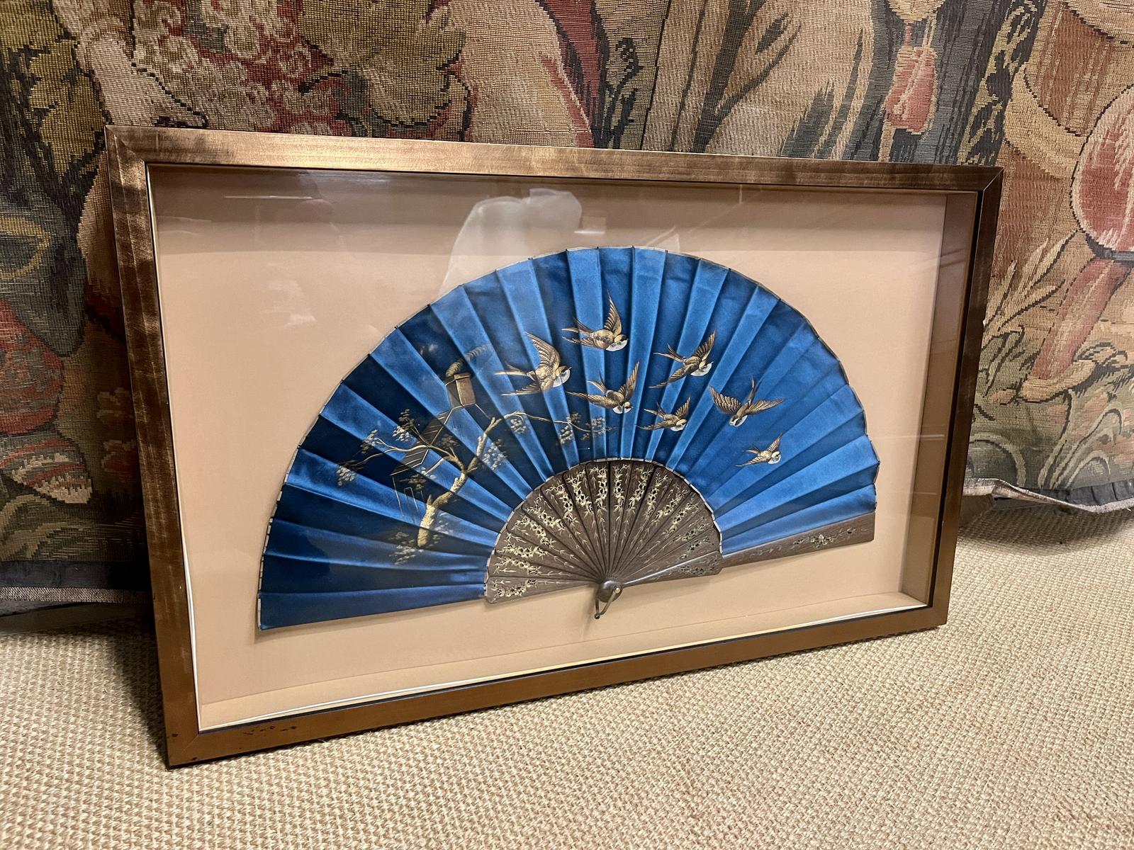 This is a stunning quality 19th Century antique Japanese fan made from blue silk with intricately carved handle. Mounted in to later frame.