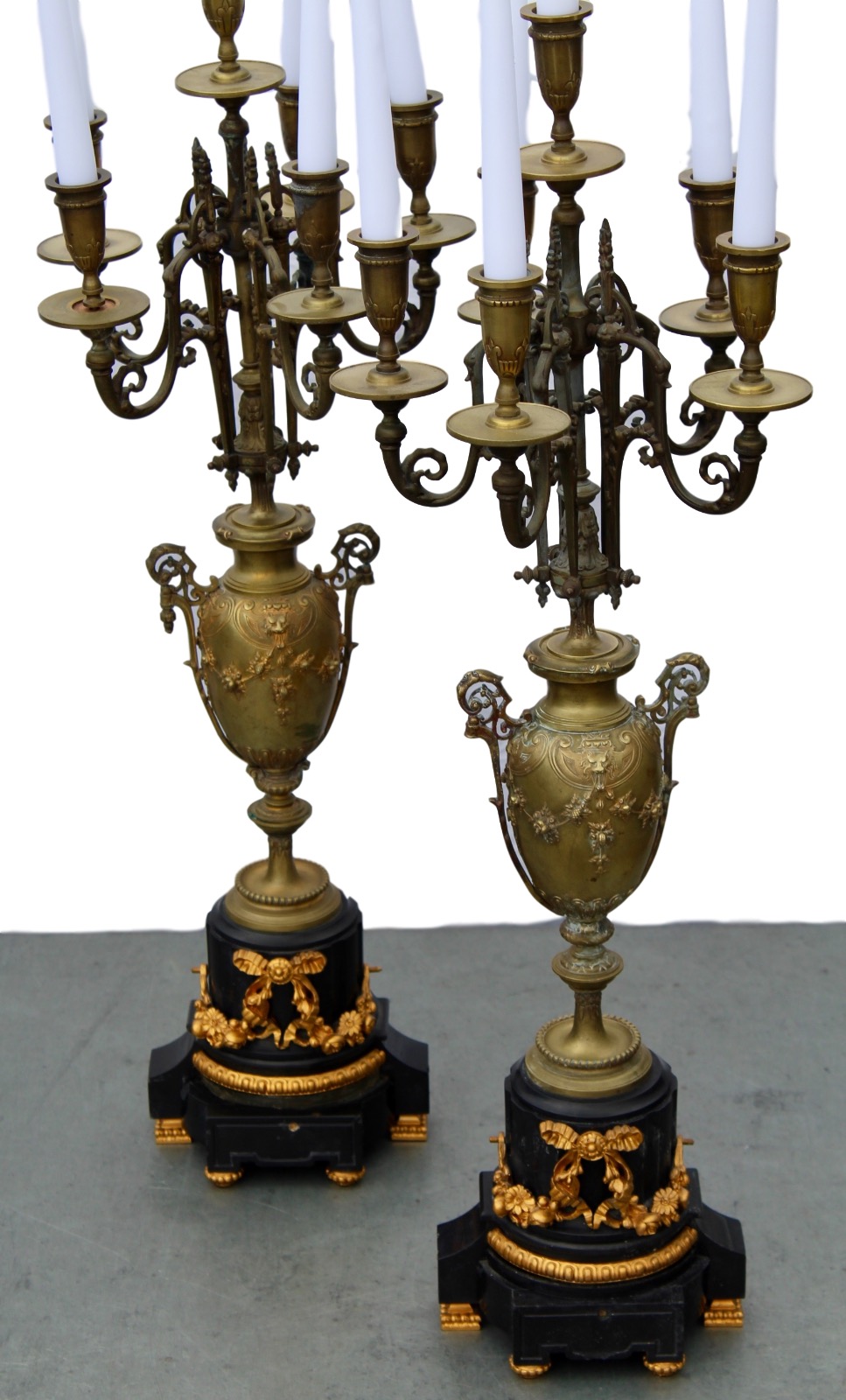 These are a stunning pair of candelabra with black marble bases. Very large and in good condition (there have been a couple of minor repairs but the overall look is still very good).