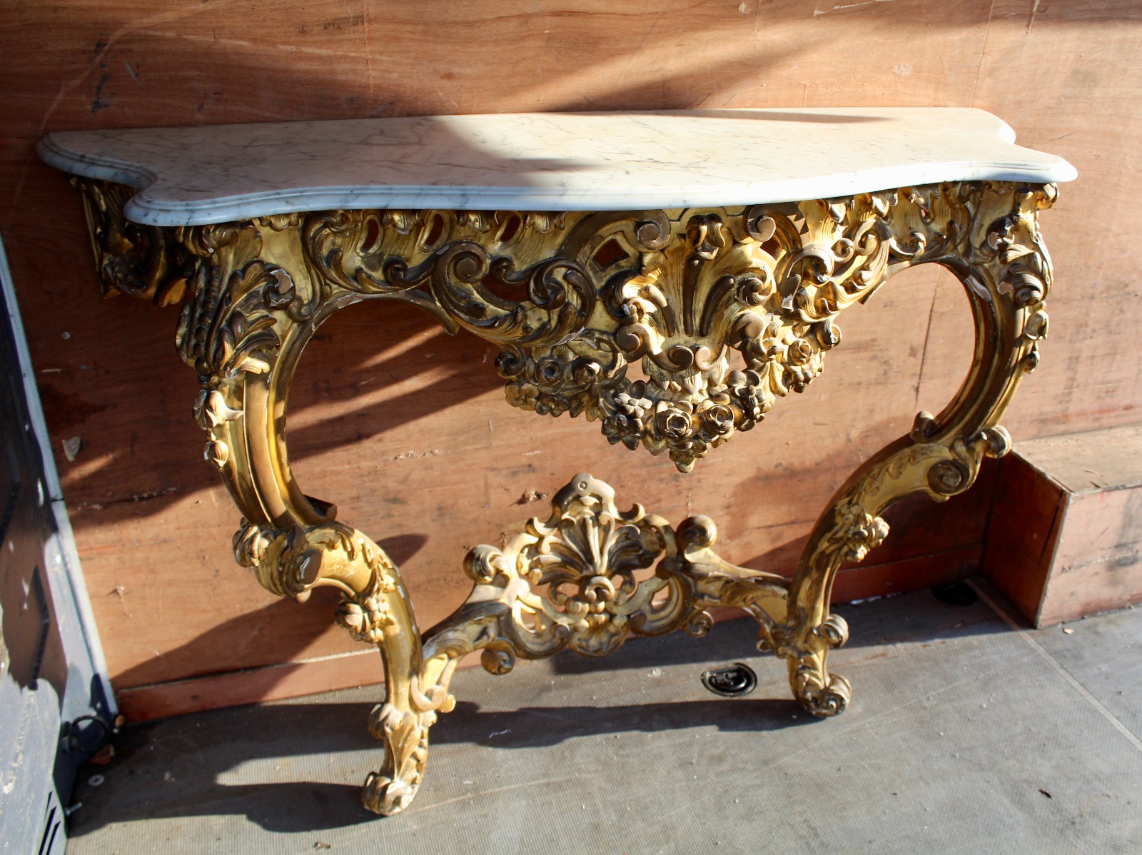 An excellent example of a ornate marble top console table made from carved wood and gilded. Some of the gilding is flaky which is not to the detriment of the piece as it shows the original wood underneath. The condition generally is good.