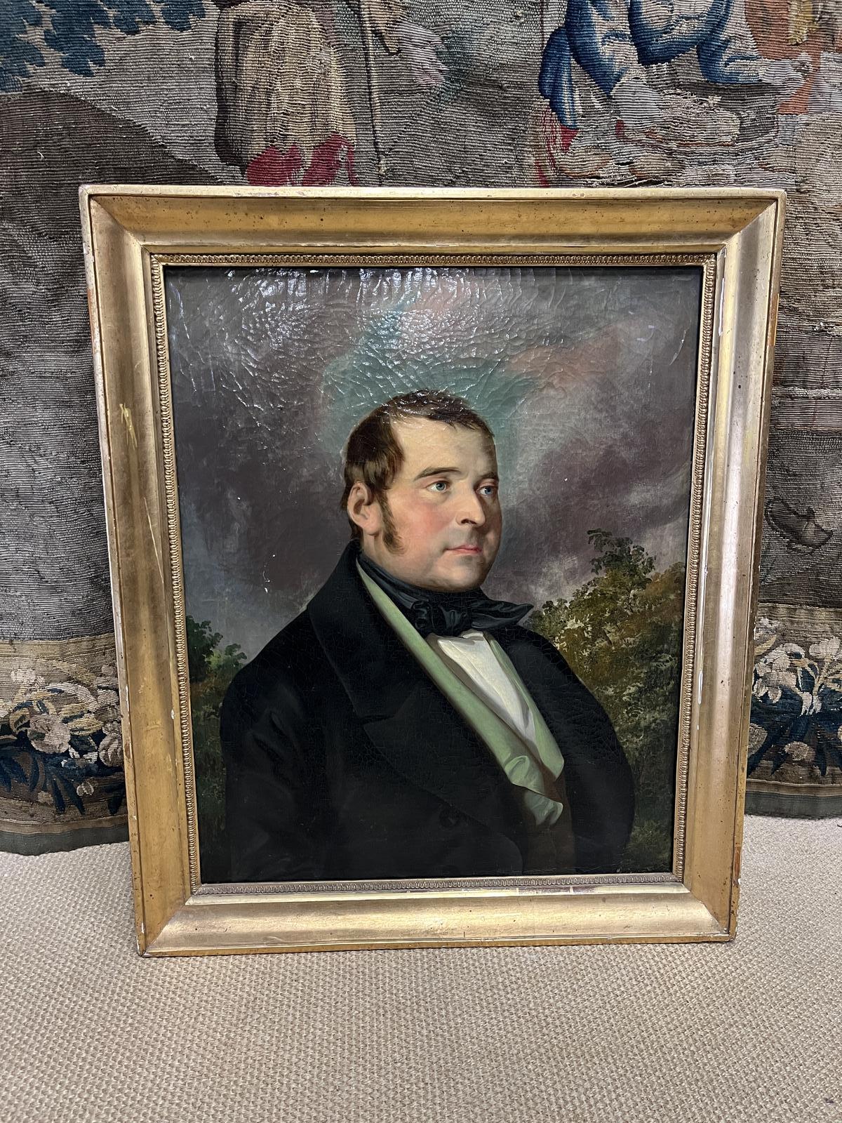 19th Century Oil on Canvas Portrait of a Gentleman Wearing Green Waistcoat