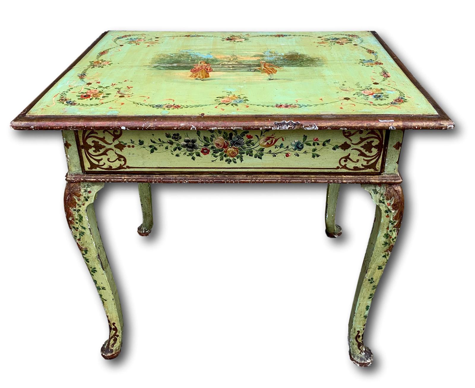 With its original vibrant green paint showing floral scenes and a man and woman to the top.