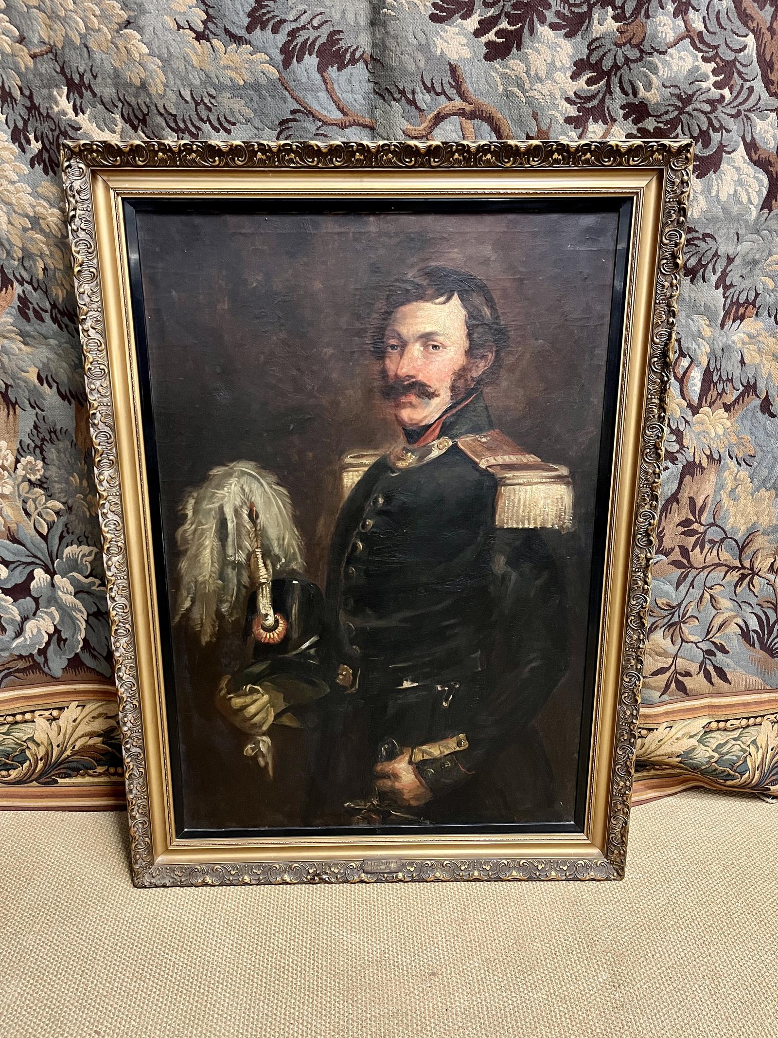 This is a superb, large 19th Century antique portrait of a French military officer. In good condition with a superb look. In later gilt frame with no losses or damage.