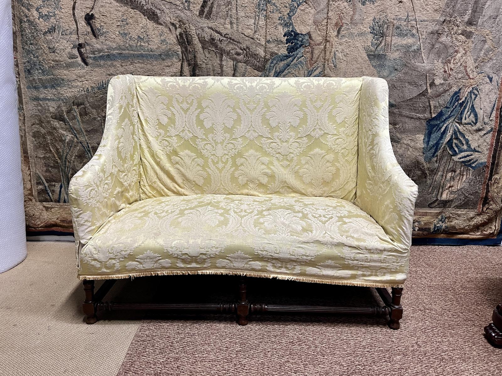 This is a superb quality late 19th Century (c.1880) antique two seater settee with turned stretchers. Covered with a loose yellow cover and calico underneath.
