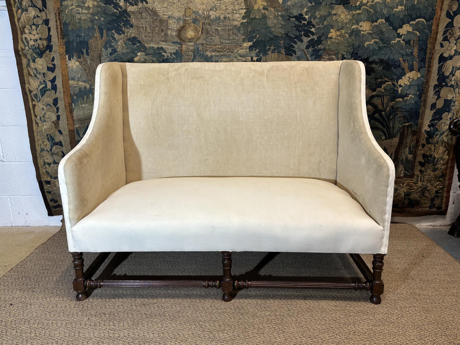 This is a superb quality late 19th Century (1880) antique two seat settee. Horse hair filled with turned legs. Covered in calico.