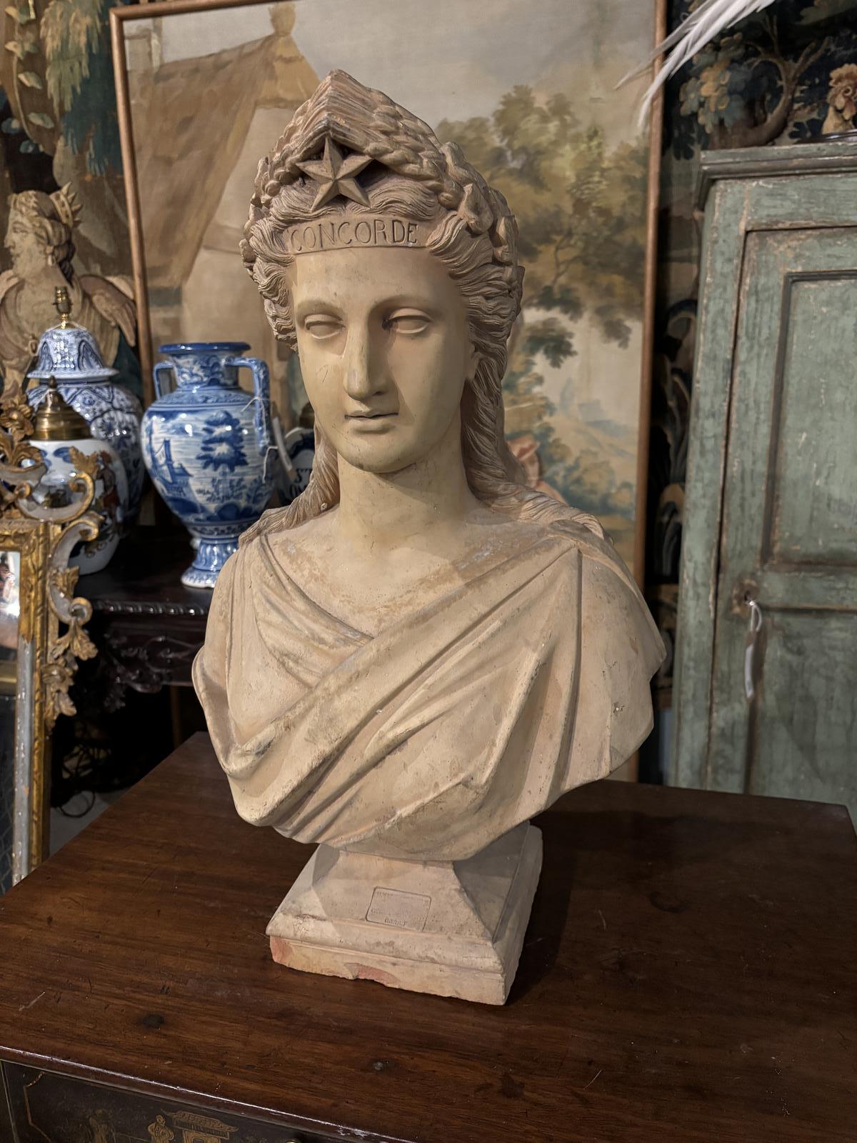 A very good quality terracotta bust of Concorde made by Mandeville and Combeléran, Castelnaudary, France - stamped to the front.