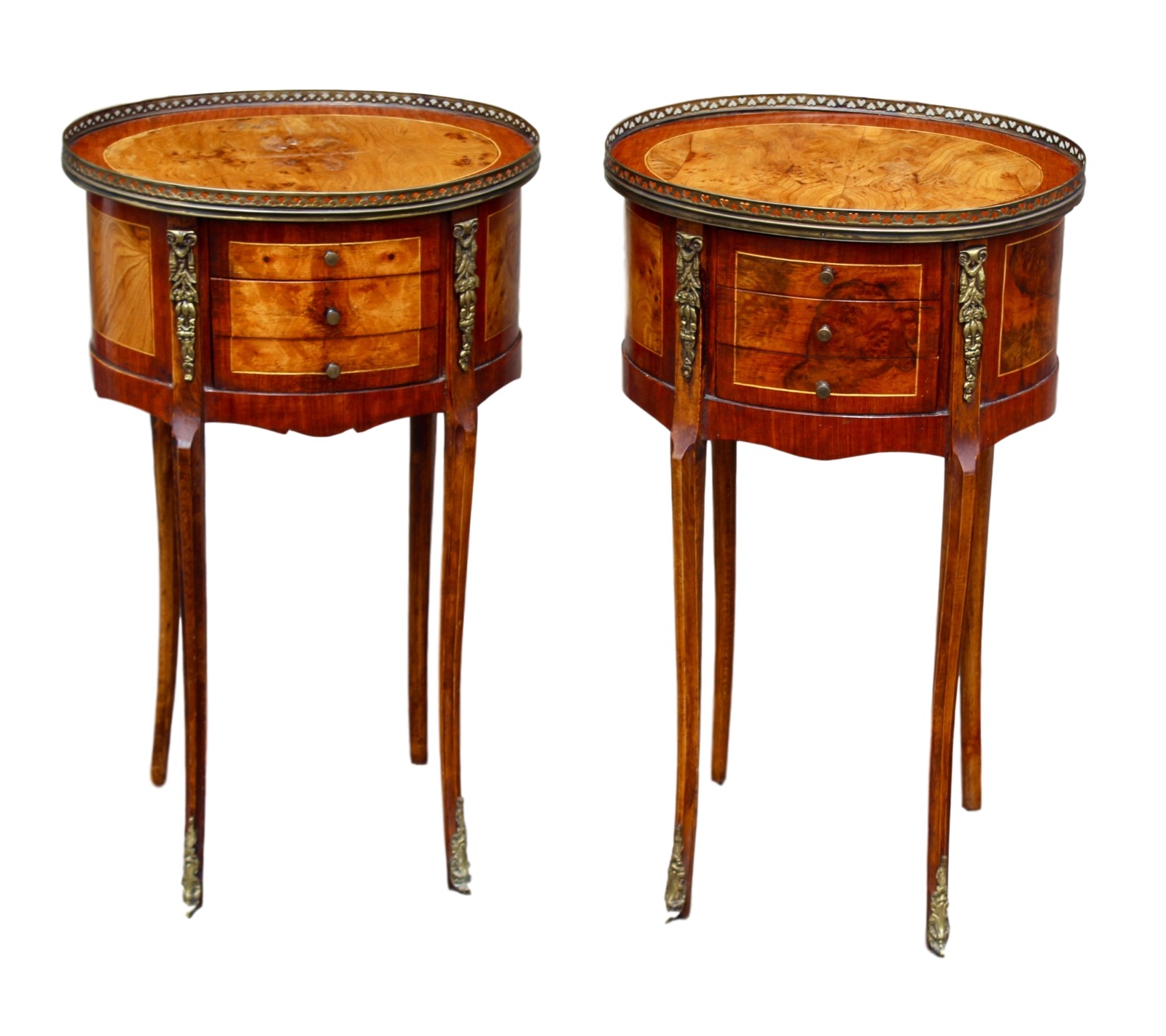 Each with three drawers, beautiful satin wood inlay and ormolu mounts. Only the finest quality Walnut has been used to make these.