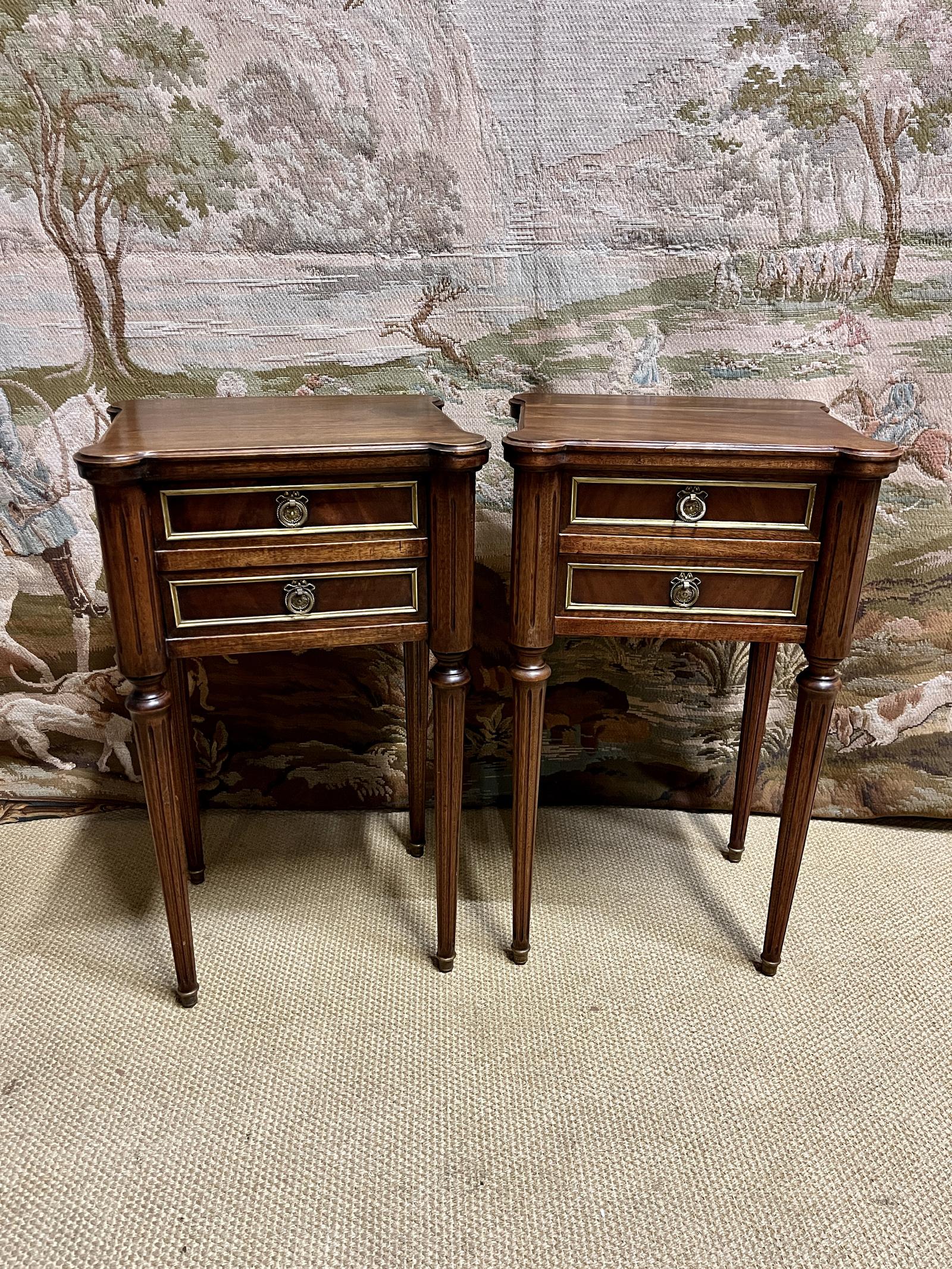 These are a superb quality pair of French bedside cabinets with brass inlay, two drawers and in good original condition.