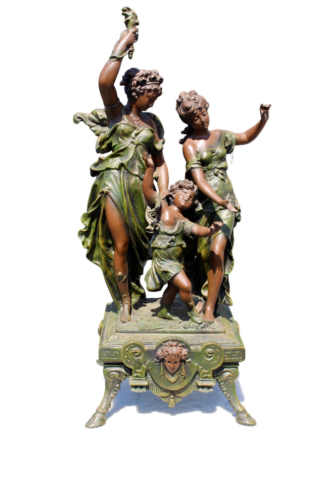 An imposing bronzed sculpture of two ladies and a child. A lovely colour, with green clothing and base.