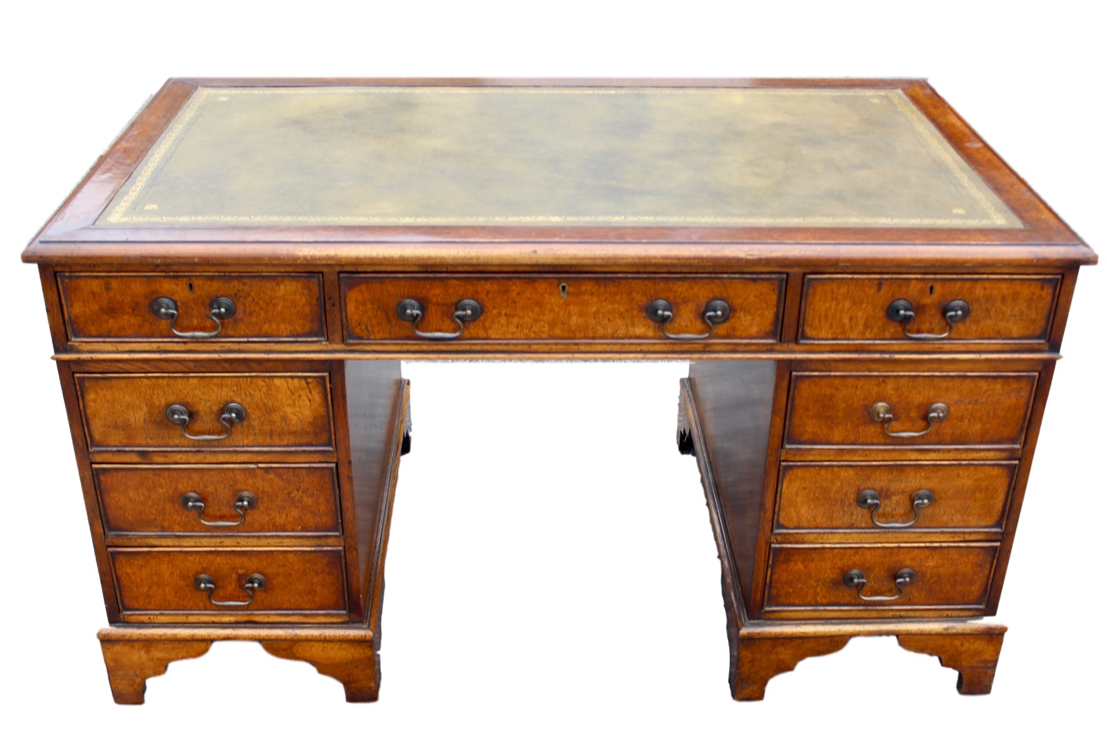 This is a lovely burr oak pedestal desk in excellent condition. Years of use in a private home have created a wonderful patina to both the leather top and the body of the desk. This has just been to our cabinet maker for a tidy up and is looking fantastic - it's a wonderful colour and excellent size.