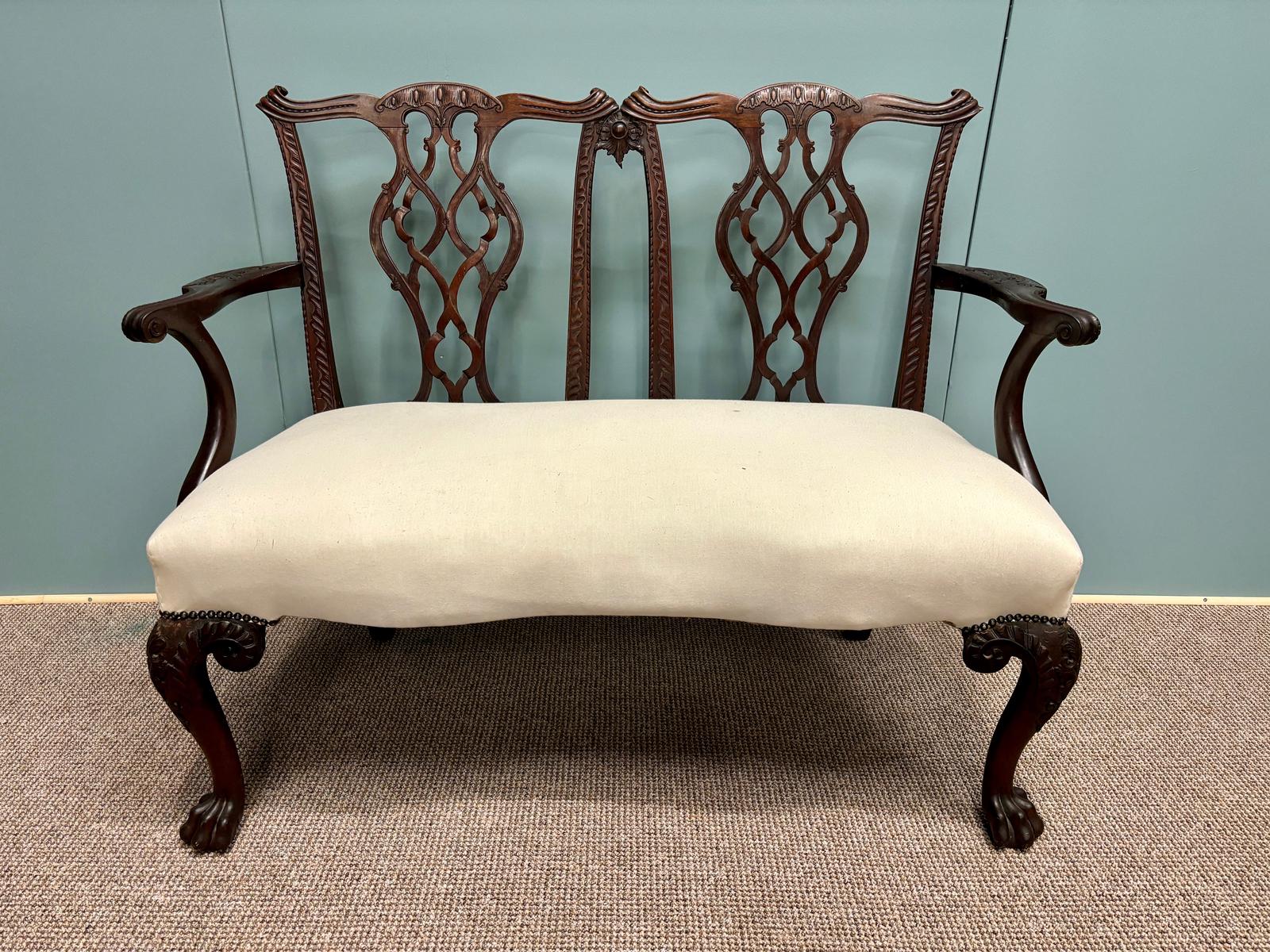 This is a superb quality mid 19th Century (1850) antique carved mahogany two seat settee in the Chippendale style and of very good quality. Upholstery is in good condition and the seat is very comfortable.