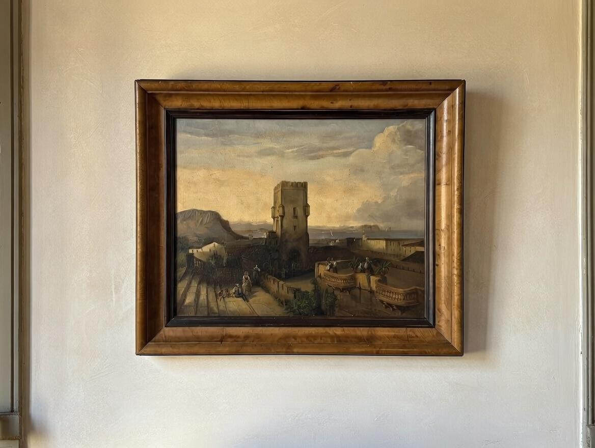 A very well painted continental (likely Italian) oil on canvas of a provincial town with a tower.