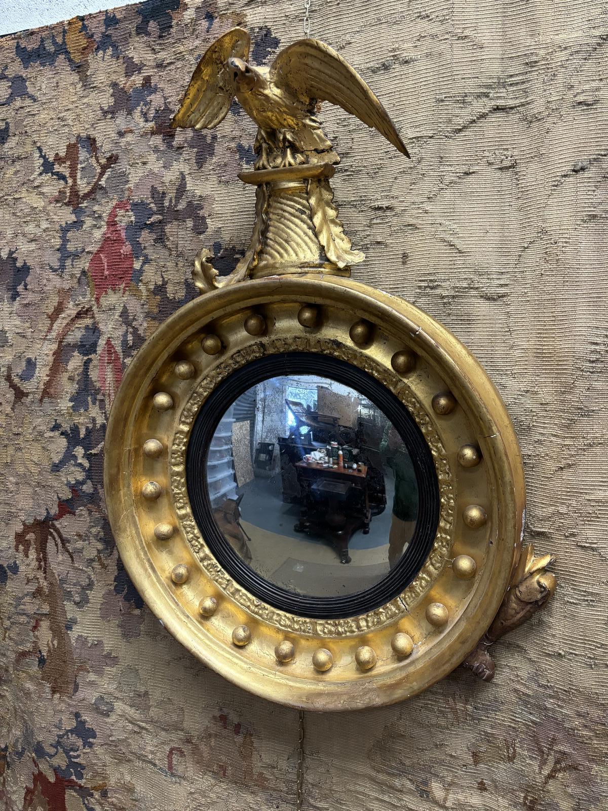 This is a very good quality, early 19th Century (1800) antique convex wall mirror in carved giltwood with Eagle decoration. There are some losses as shown in the photos however the overall look is excellent.