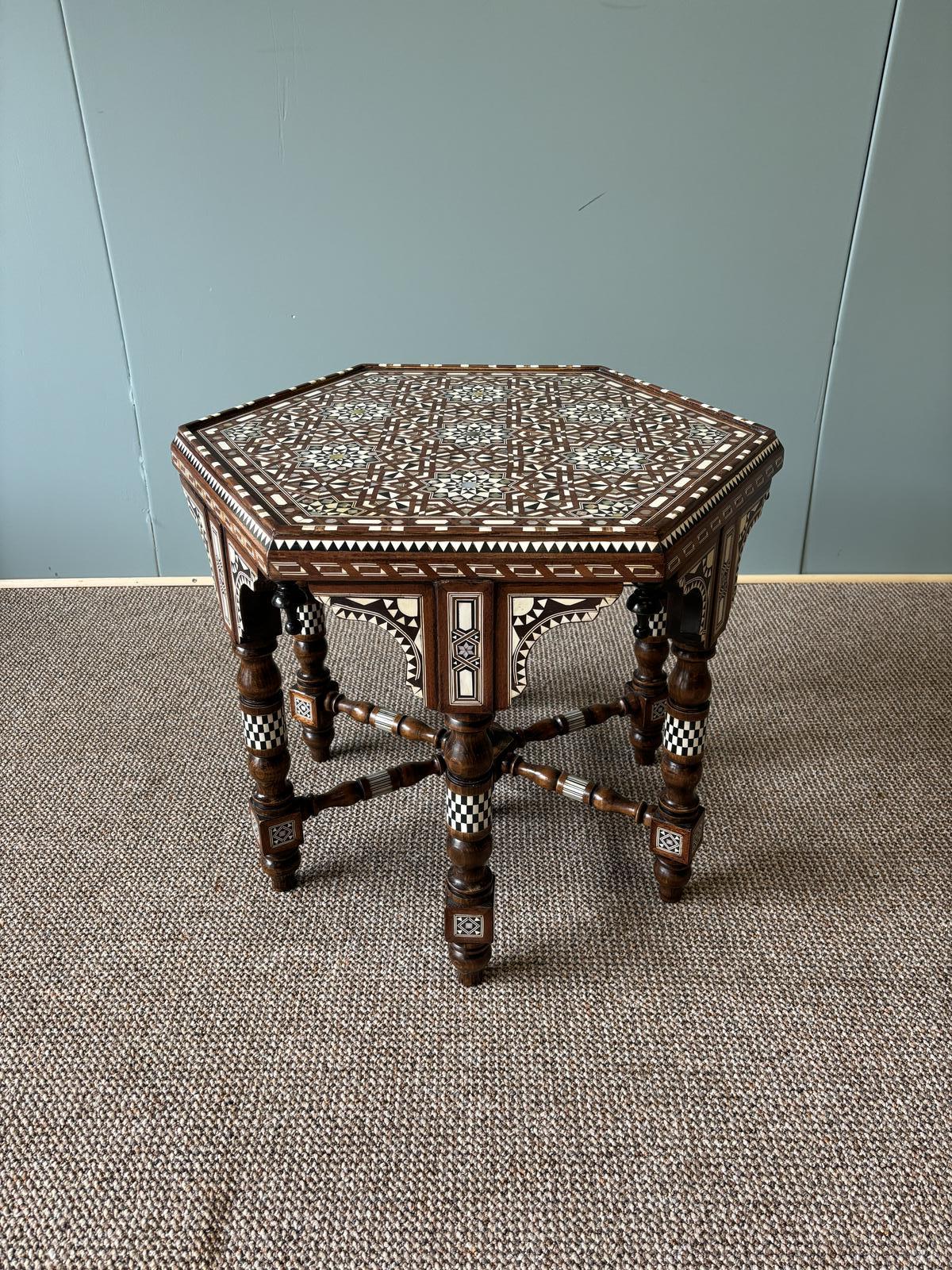 This is a superb quality inlaid occasional table, which is eastern in origin and decorated throughout with mother of pearl, bone and ebony decoration. In very good original condition with no losses.