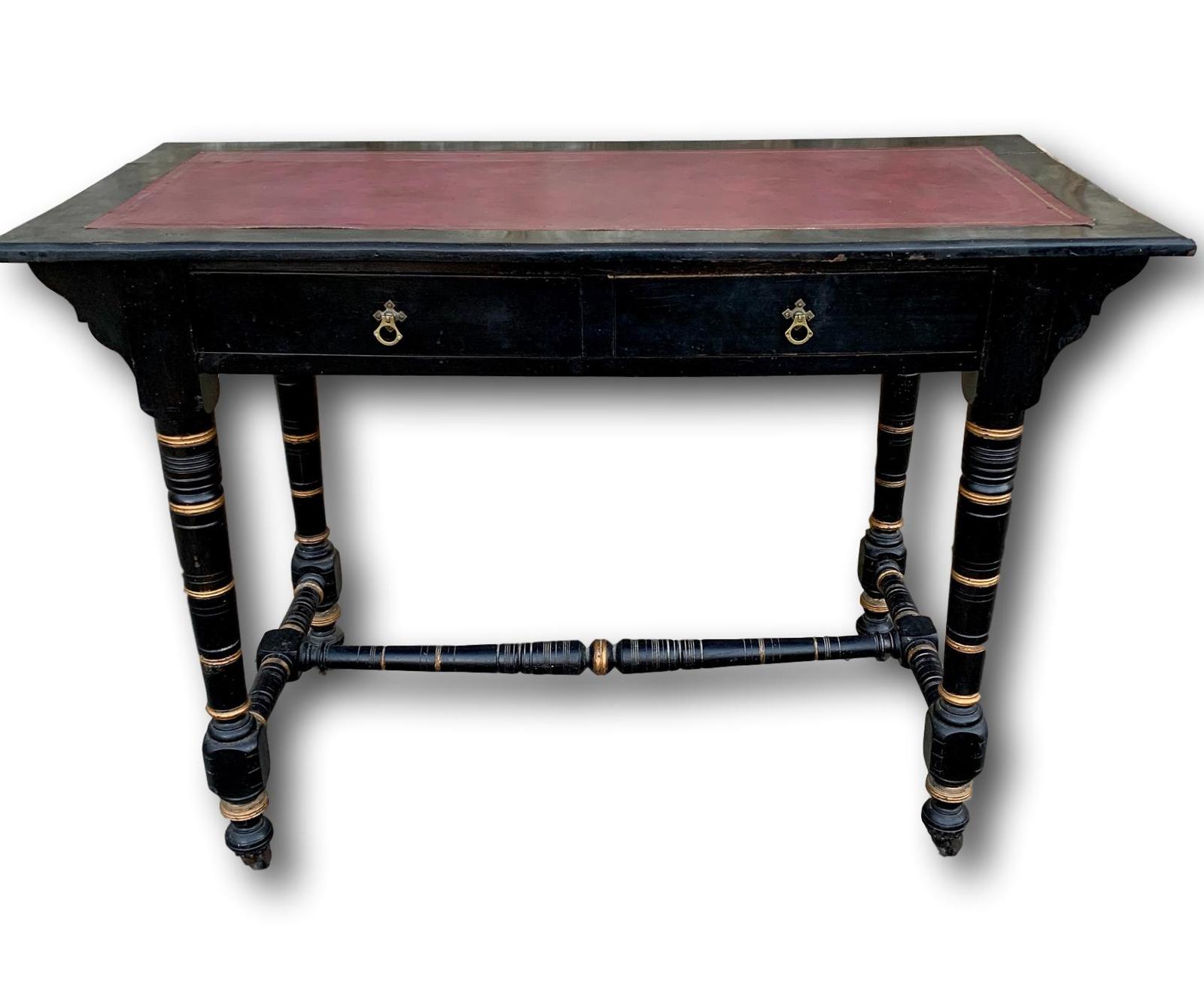 Ebonised and with gilt banding to the legs. Two drawers to the front and a red leather top.