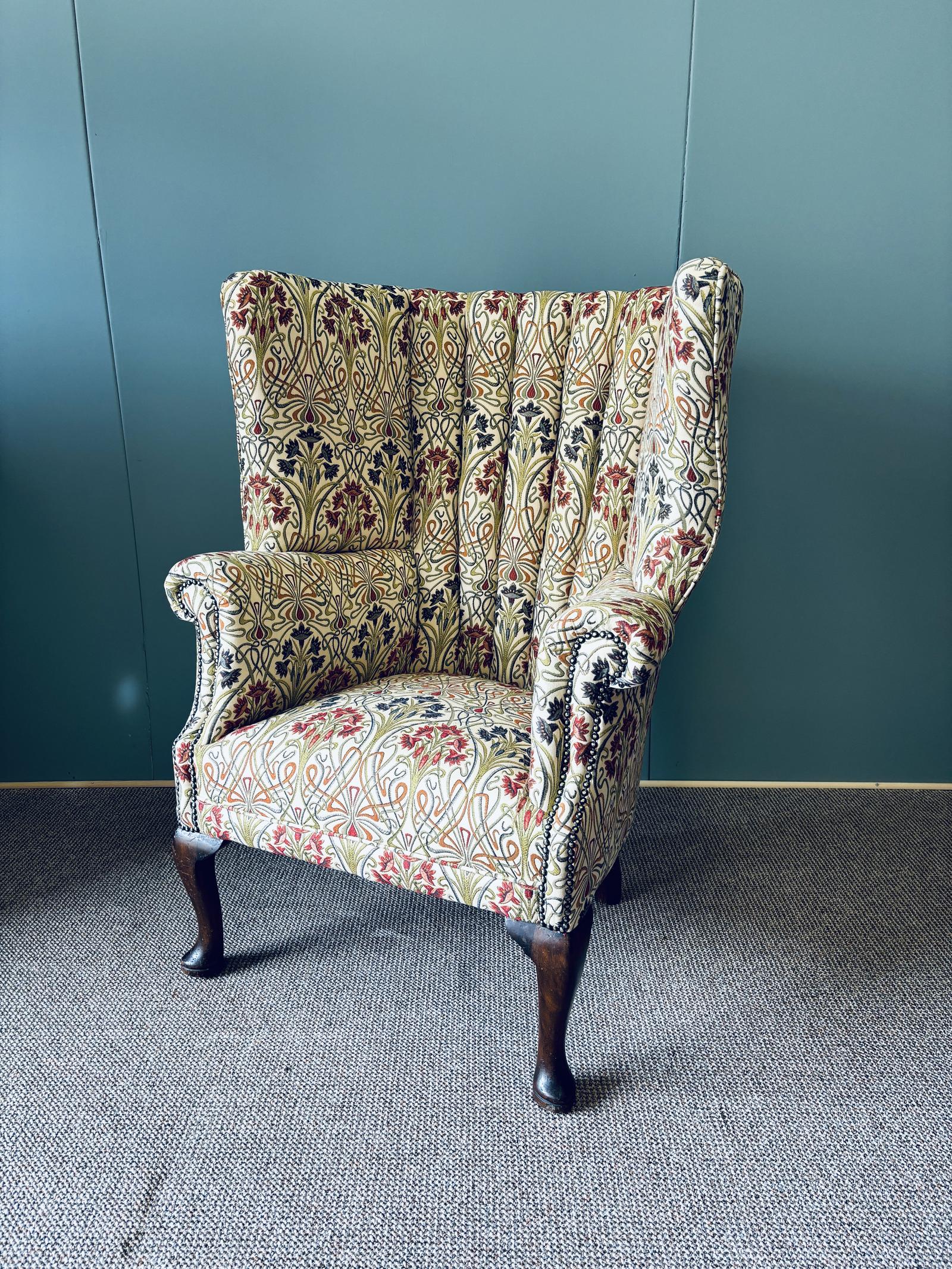 This is a stunning mid 19th Century (1850) English antique armchair on a superb scale and upholstered in beautiful Tiffany Jewel fabric.
