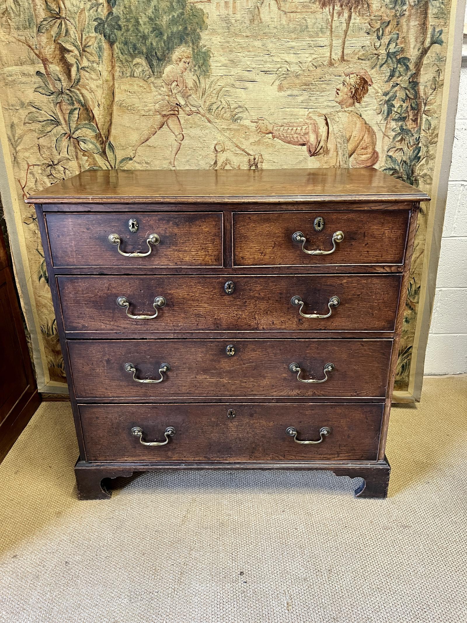 This is a lovely 18th Century English Georgian antique Country chest of drawers made from oak with swan neck handles. In country house condition.