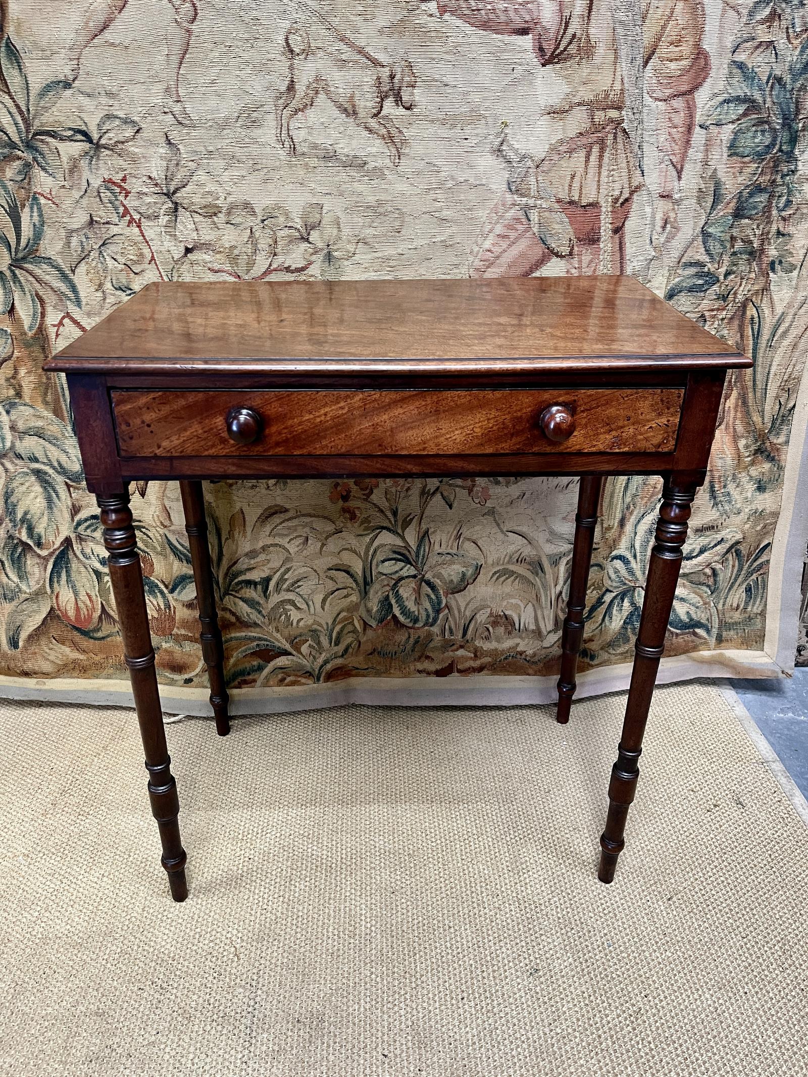 This is a good quality 18th Century English Georgian (1780) antique mahogany table with single drawer to the front and turned legs. In good original condition.