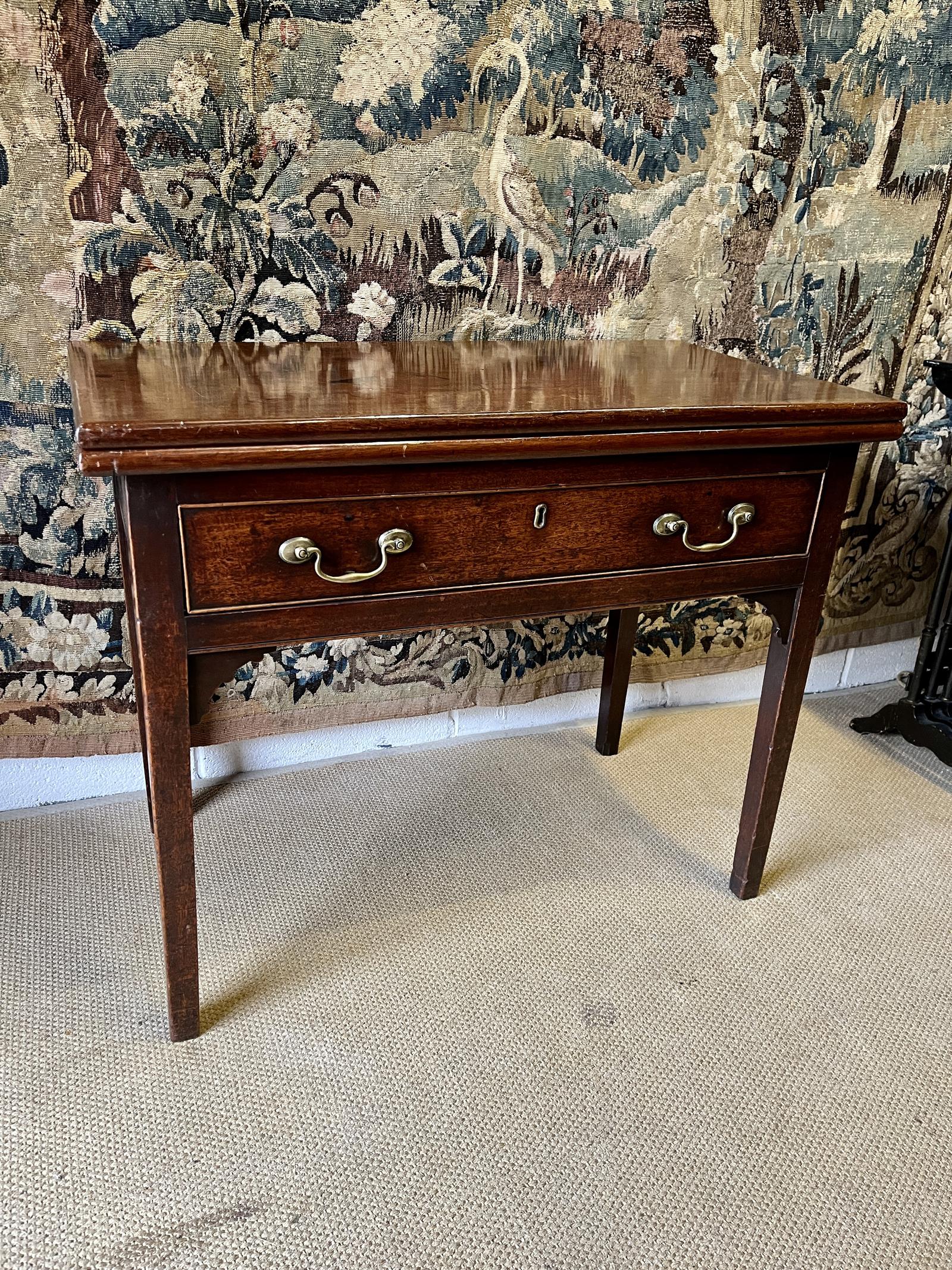 This is a very good quality 18th Century English Georgian antique side or writing table. An unusual model having a fold over top. In very good original condition with brass handles and fittings.
