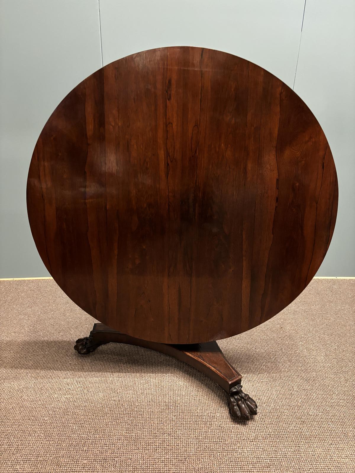 This is a very good quality early 19th Century (1815) English Regency antique rosewood occasional table in good overall condition. It stands on bulb base with paw feet and bass casters.