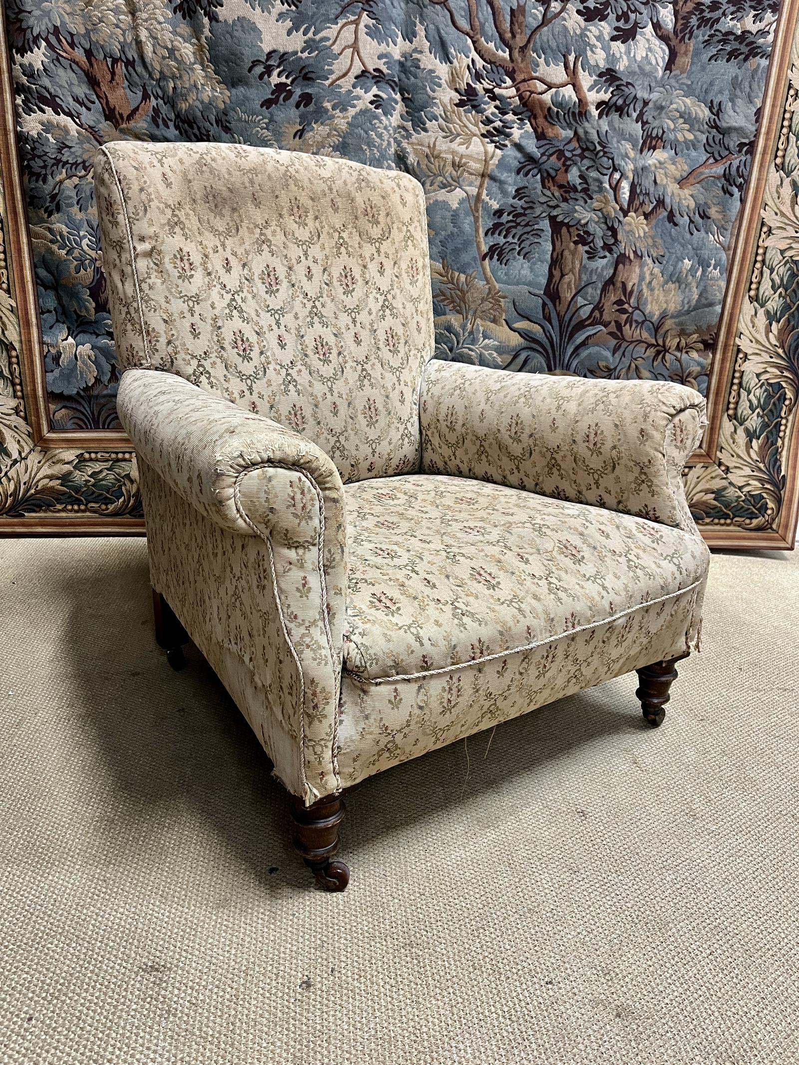 This is a very good quality late 19th Centur English Victorian (1890) antique armchair standing on turned legs with brass casters. A very good project for re-upholstery.