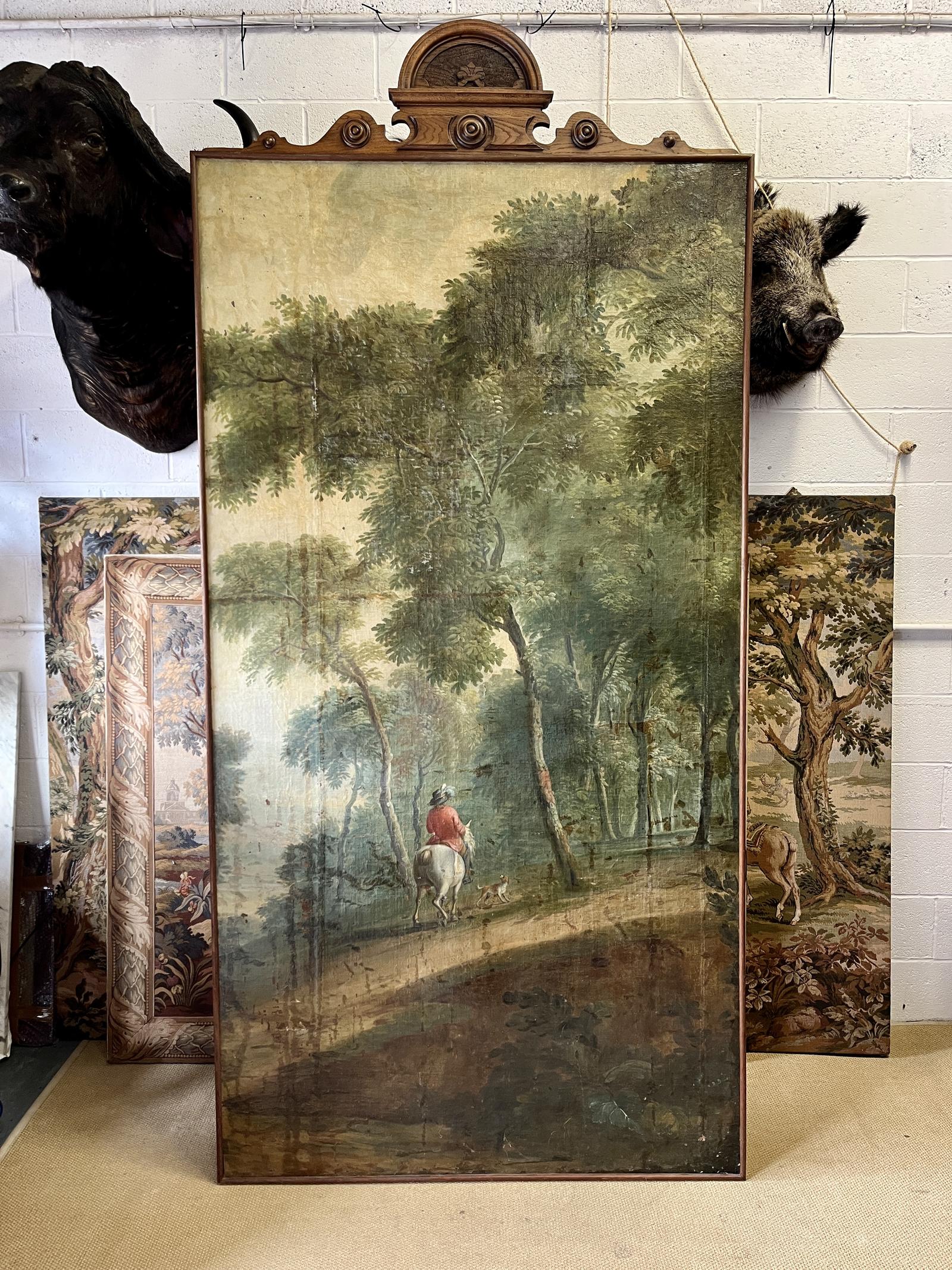 This is a stunning, exceptionally large oil on canvas. European and showing a man riding a pony with his dog in woodland. In a plain oak frame. The painting has retained its bright colours, however has suffered some minor water damage as shown in photos.