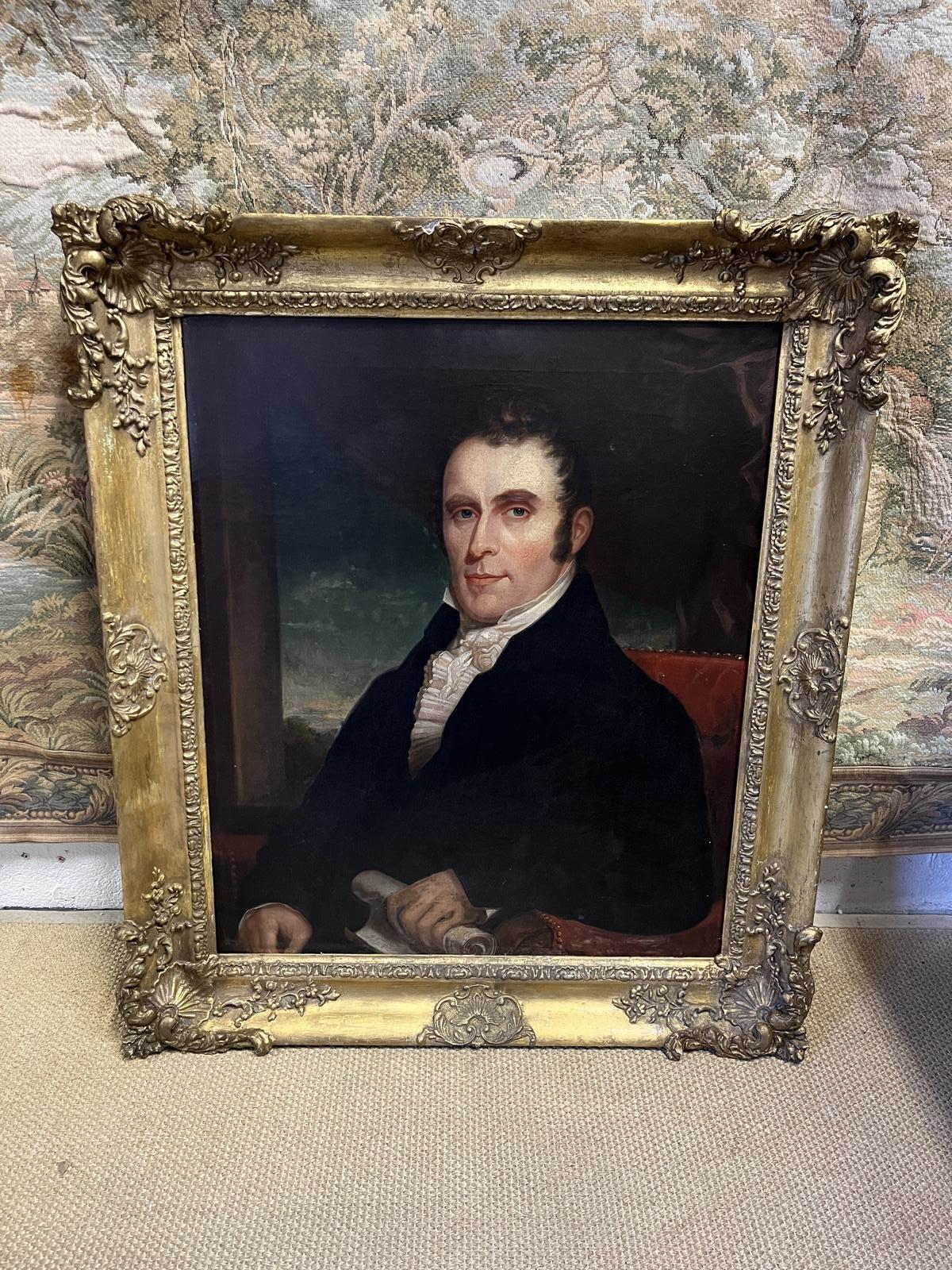 This is a superb example of an English 19th Century (1810) antique oil on canvas portrait.Showing a gentleman in formal dress sitting on a red armchair. Possibly a young Wellington. In very good quality carved gilt frame with no losses.