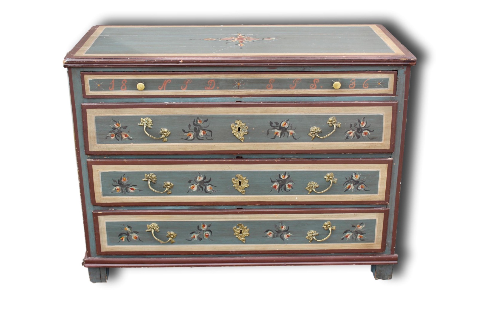 This is a beautifully painted Danish commode which is dated 1836 and still in its original paint, this a truly beautiful piece of European 19th Century furniture. The top drawer is inscribed with the following 'In Remembrance of My Grandmother in Gogen'. Presumably this was originally given as a gift.