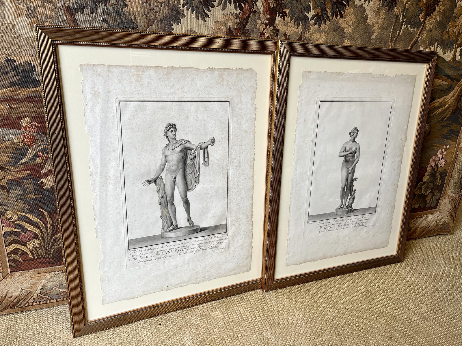 Fabulous pair of 18th Century engravings by Francesco Piranesi (1758/1759- 1810) depicting Apollo Belvedere and Venus. Dated 1781 and 1783.