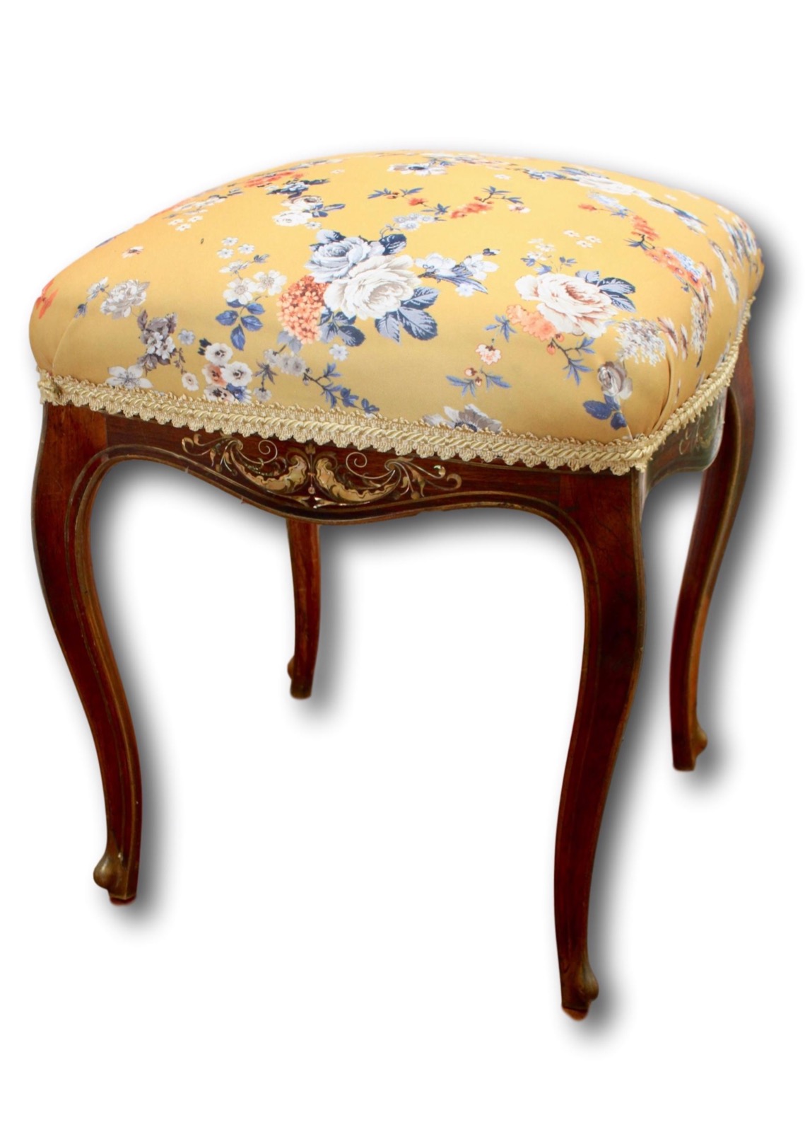 Newly recovered in a pretty yellow fabric with floral pattern.